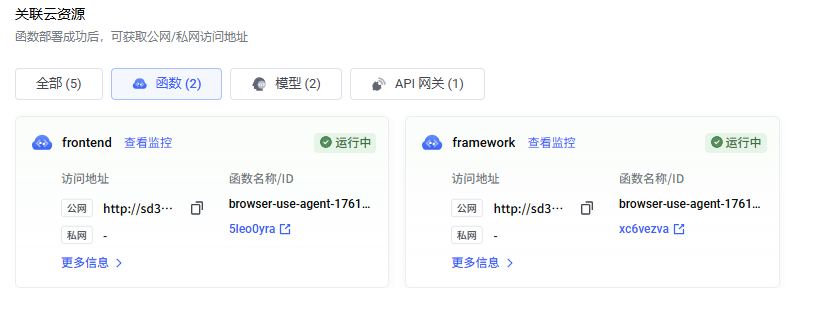 函数服务会为您的 Serverless AI 应用创建两个函数。如您希望直接访问应用的前端页面,则选择名称以 -web 结尾的函数。