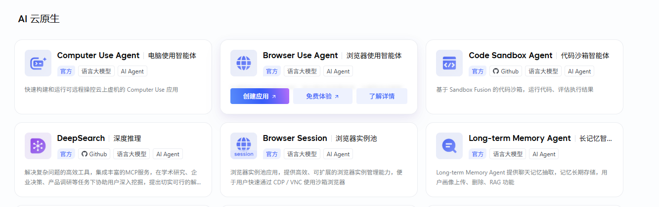 在 AI 云原生 分类下,找到 Browser Use Agent 模板,然后点击模板中的 创建应用 。