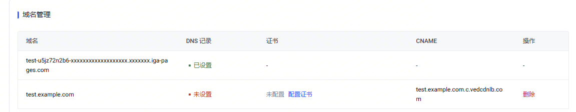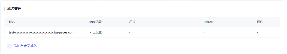 您的域名被绑定后,在您的域名记录的 CNAME 列,会显示系统分配的 CNAME 名称。您需要在您的 DNS 服务商处创建一条 CNAME 记录,将您的域名指向该 CNAME 名称。