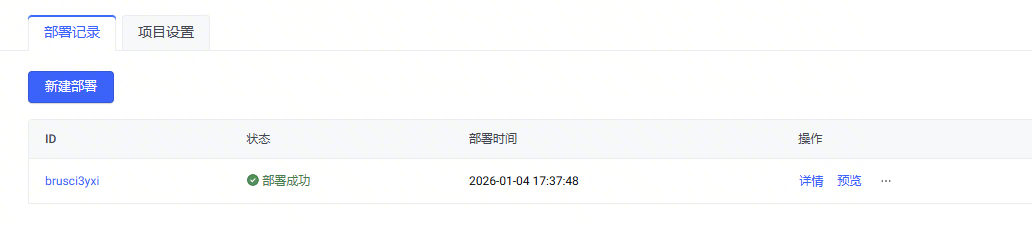 项目创建完成后,您会进入到 部署记录 标签页,有一个新的部署生成,处于 部署中 状态。等待部署变成 部署成功 状态后,点击部署操作列的 预览 或 页面右上角的 预览。