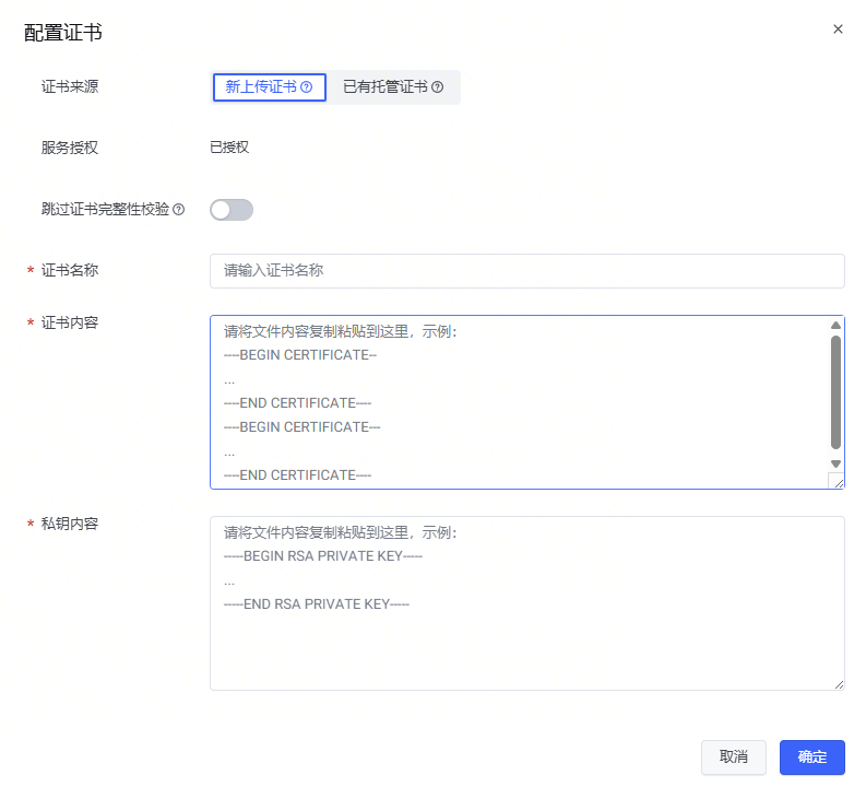直接上传证书或选择在证书中心的已有证书,然后点击 确定。