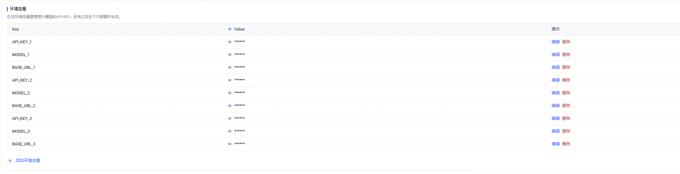 如果您在创建项目时添加了多个大模型配置,系统则会为每个大模型配置创建三个环境变量,变量名加序号后缀,例如,第一大模型配置的三个变量为 BASE_URL_1、MODEL_1、API_KEY_1,依此类推。