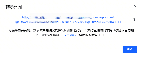 在弹出的对话框中,点击预览地址访问应用。