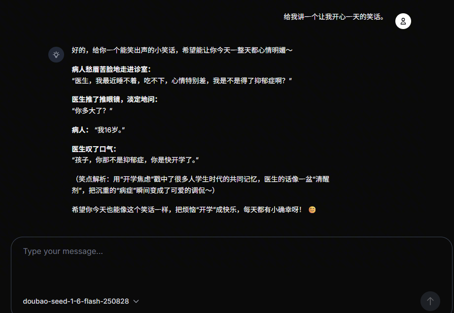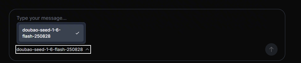由于我们使用了“一键快速创建大模型”(默认模型),所以下拉列表中只有 doubao-seed-1-6-flash-250828模型。