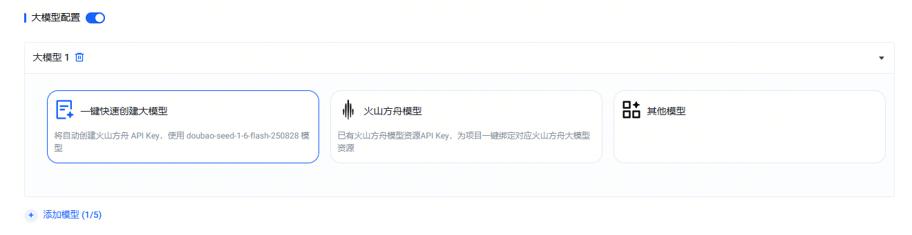 此时,大模型配置 会自动开启,在 大模型1 条目中,选择 一键快速创建大模型。