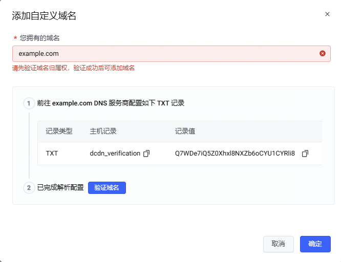 在添加 添加自定义域名 对话框中,输入您的域名。首次添加某域名时,系统会提示您验证您对该域名的所有权。您需要按界面上提示的要求,在您的 DNS 服务商处添加一条 txt 记录,包含系统提供的记录值。等该 txt 记录生效后点击 验证域名。