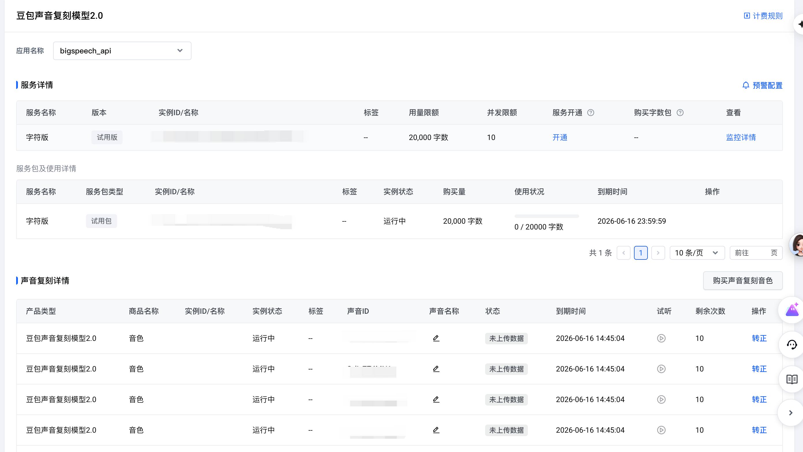 3. 需要注意的是:购买克隆音色之后目前是分钟级生效,即2分钟之后才可以发起音色注册请求