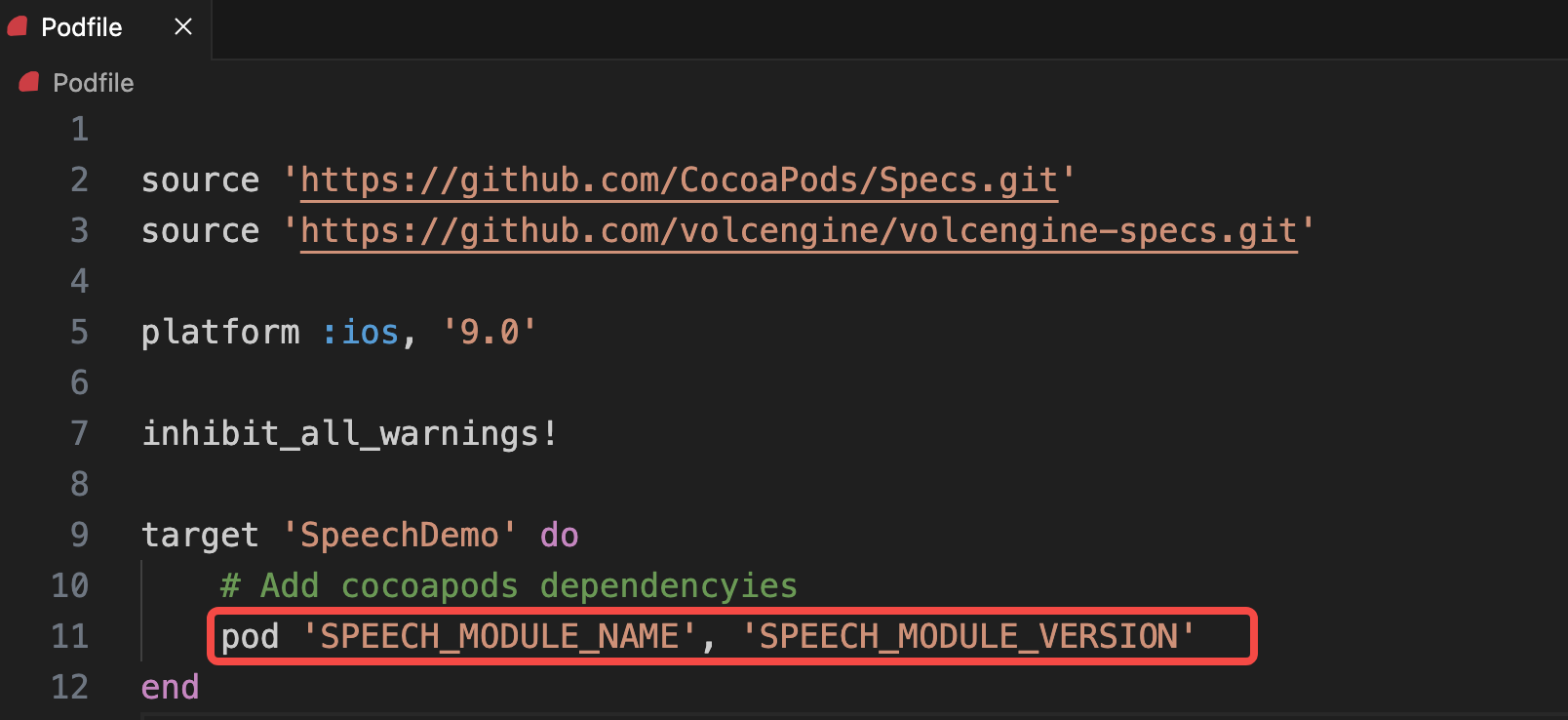 source 'https://github.com/CocoaPods/Specs.git' source 'https://github.com/volcengine/volcengine-specs.git' # TTNet pod 'TTNetworkManager', '{LATEST_VERSION}' # Speech pod 'SpeechEngineToB', '{LATEST_VERSION}'