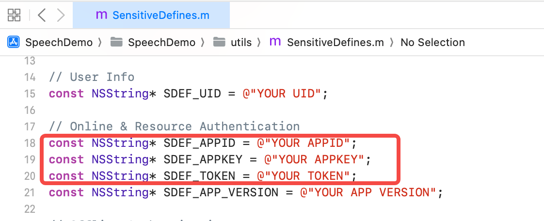//【必需配置】Engine Name [self.curEngine setStringParam:SE_BITTS_ENGINE forKey:SE_PARAMS_KEY_ENGINE_NAME_STRING]; //【可选配置】本地日志文件路径,SDK会在该路径文件夹下生成名为 speech_sdk.log 的日志文件,开发时设置,线上关闭。 [self.engine setStringParam:@"已存在的文件夹路径,或者空字符串" forKey:SE_PARAMS_KEY_DEBUG_PATH_STRING]; //【可选配置】日志级别,开发时设置为 TRACE(最低级别),线上设置 WARN; [self.engine setStringParam:SE_LOG_LEVEL_TRACE forKey:SE_PARAMS_KEY_LOG_LEVEL_STRING]; //【可选配置】自定义请求Header [self.curEngine setStringParam:headerStr forKey:SE_PARAMS_KEY_REQUEST_HEADERS_STRING]; //【可选配置】是否使用 SDK 内置播放器播放合成出的音频,默认为 true [self.curEngine setBoolParam:[self.settings getBool:SETTING_TTS_ENABLE_PLAYER] forKey:SE_PARAMS_KEY_TTS_ENABLE_PLAYER_BOOL]; //【可选配置】是否令 SDK 通过回调返回播放器播放的pcm音频数据,默认不返回。 // 开启后,SDK 会流式返回音频,收到 SEPlayerStartPlayAudio SEPlayerFinishPlayAudio表示开始播放当前句对应音频 //收到SEPlayerAudioData表示流式的pcm音频数据 [self.curEngine setBoolParam:[self.settings getBool:SETTING_ENABLE_PLAYER_AUDIO_CALL_BACK] ? SETtsDataCallbackModeAll : SETtsDataCallbackModeNone forKey:SE_PARAMS_KEY_ENABLE_PLAYER_AUDIO_CALLBACK_BOOL]; //【可选配置】是否将合成出的音频保存到设备上,为 true 时需要正确配置 PARAMS_KEY_TTS_AUDIO_PATH_STRING 才会生效 [self.curEngine setBoolParam:[self.settings getBool:SETTING_TTS_ENABLE_DUMP] //【可选配置】TTS播放文件保存路径,如不为空字符串,则SDK会将播放器音频保存到该路径下,文件格式为 .wav [self.curEngine setStringParam:self.debugPath forKey:SE_PARAMS_KEY_TTS_AUDIO_PATH_STRING]; //【必需配置】在线合成鉴权相关:Appid [self.curEngine setStringParam:self.ttsAppId forKey:SE_PARAMS_KEY_APP_ID_STRING]; //【必需配置】语音合成服务域名 [self.curEngine setStringParam:ttsAddress forKey:SE_PARAMS_KEY_TTS_ADDRESS_STRING]; //【必需配置】语音合成服务Uri [self.curEngine setStringParam:ttsUri forKey:SE_PARAMS_KEY_TTS_URI_STRING]; //【必需配置】语音合成服务资源id [self.curEngine setStringParam:resourceId forKey: SE_PARAMS_KEY_RESOURCE_ID_STRING]; //【可选配置】TTS连接超时时间 [self.curEngine setIntParam:10000 forKey:SE_PARAMS_KEY_TTS_CONN_TIMEOUT_INT]; //【必需配置】StarSession时的payload,指定音频生成相关参数,不包含待合成的文本 [self.curEngine setStringParam:startPayload forKey:SE_PARAMS_KEY_START_ENGINE_PAYLOAD_STRING];