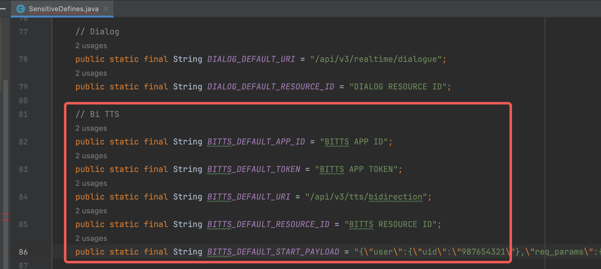 //【必需配置】Engine Name mSpeechEngine.setOptionString(SpeechEngineDefines.PARAMS_KEY_ENGINE_NAME_STRING,SpeechEngineDefines.BITTS_ENGINE); //【可选配置】本地日志文件路径,SDK会在该路径文件夹下生成名为 speech_sdk.log 的日志文件,开发时设置,线上关闭。 engine.setOptionString(SpeechEngineDefines.PARAMS_KEY_DEBUG_PATH_STRING, "已存在的文件夹路径,或者空字符串"); //【可选配置】日志级别,开发时设置为 TRACE(最低级别),线上设置 WARN; engine.setOptionString(SpeechEngineDefines.PARAMS_KEY_LOG_LEVEL_STRING, SpeechEngineDefines.LOG_LEVEL_TRACE); //【必需配置】鉴权相关:Appid engine.setOptionString(SpeechEngineDefines.PARAMS_KEY_APP_ID_STRING, "APPID"); //【必需配置】鉴权相关:Token engine.setOptionString(SpeechEngineDefines.PARAMS_KEY_APP_TOKEN_STRING, "ACCESS TOKEN"); //【必需配置】语音合成服务域名 mSpeechEngine.setOptionString(SpeechEngineDefines.PARAMS_KEY_TTS_ADDRESS_STRING, "wss://openspeech.bytedance.com"); //【必需配置】语音合成服务Uri mSpeechEngine.setOptionString(SpeechEngineDefines.PARAMS_KEY_TTS_URI_STRING, "/api/v3/tts/bidirection"); //【必需配置】语音合成服务Resource id mSpeechEngine.setOptionString(SpeechEngineDefines.PARAMS_KEY_RESOURCE_ID_STRING, "RESOURCE ID"); //【必需配置】语音合成服务StartSession时传入的音频相关参数,json字符串格式 mSpeechEngine.setOptionString(SpeechEngineDefines.PARAMS_KEY_START_ENGINE_PAYLOAD_STRING,startSessionPayload); //【可选配置】语音合成服务链接超时时间 mSpeechEngine.setOptionInt(SpeechEngineDefines.PARAMS_KEY_TTS_CONN_TIMEOUT_INT,100000); //【可选配置】是否将合成出的音频保存到设备上,为 true 时需要正确配置 PARAMS_KEY_TTS_AUDIO_PATH_STRING 才会生效 mSpeechEngine.setOptionBoolean(SpeechEngineDefines.PARAMS_KEY_TTS_ENABLE_DUMP_BOOL,true); //【可选配置】 TTS 播放音频文件保存目录,必须在合成之前创建好且 APP 具有访问权限,保存的音频文件名格式为 tts_{reqid}.wav, {reqid} 是本次合成的请求 id // PARAMS_KEY_TTS_ENABLE_DUMP_BOOL 配置为 true 的音频时为【必需配置】,否则为【可选配置】 mSpeechEngine.setOptionString(SpeechEngineDefines.PARAMS_KEY_TTS_AUDIO_PATH_STRING, mDebugPath); //【可选配置】语音合成服务请求的Header部分额外参数 mSpeechEngine.setOptionString(SpeechEngineDefines.PARAMS_KEY_REQUEST_HEADERS_STRING,"{}"); //【可选配置】是否使用内置播放器播放TTS音频 mSpeechEngine.setOptionBoolean(SpeechEngineDefines.PARAMS_KEY_TTS_ENABLE_PLAYER_BOOL,true); //【可选配置】是否打开播放器的数据回调 mSpeechEngine.setOptionBoolean(SpeechEngineDefines.PARAMS_KEY_ENABLE_PLAYER_AUDIO_CALLBACK_BOOL,true);