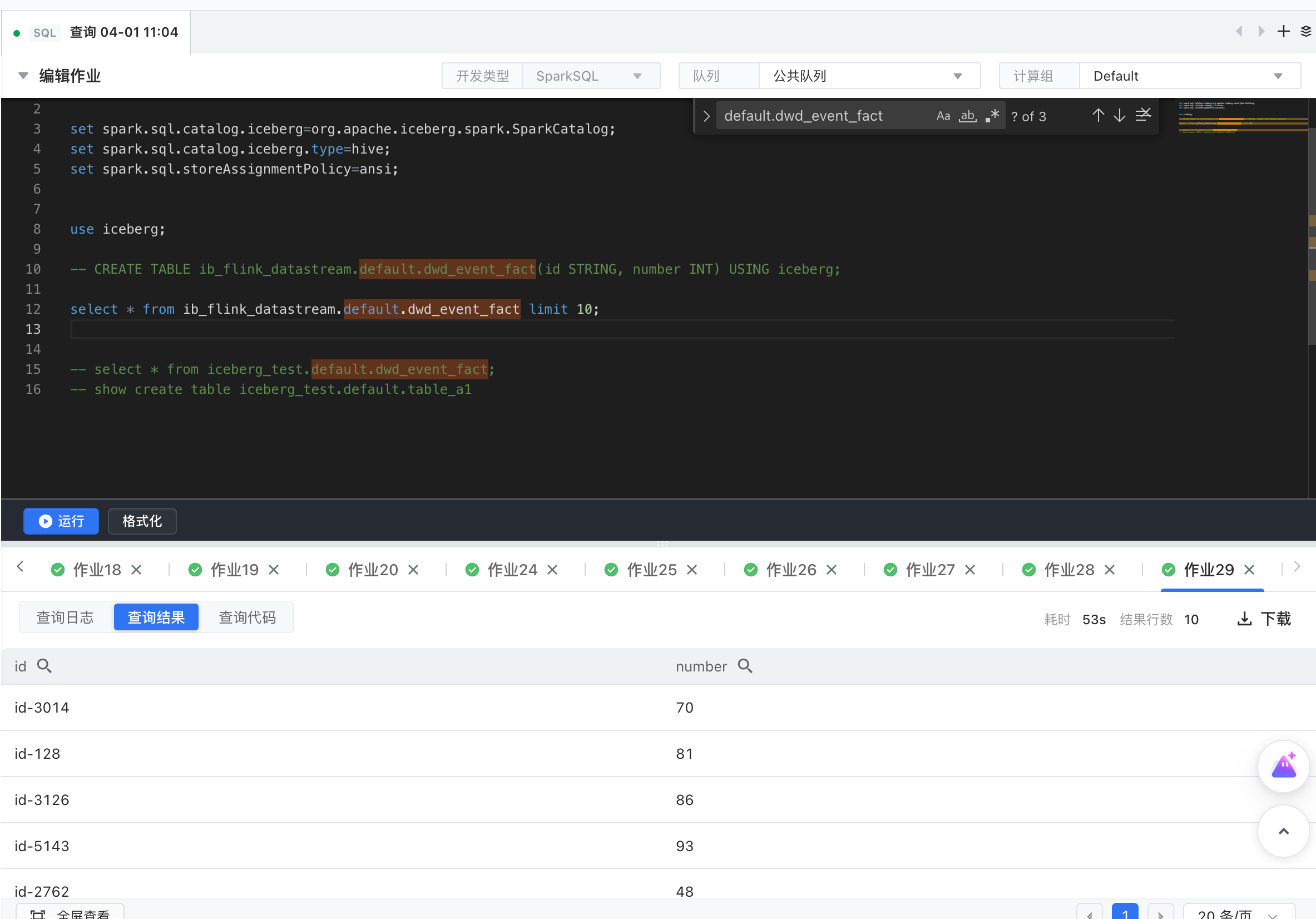 set spark.sql.catalog.iceberg=org.apache.iceberg.spark.SparkCatalog; set spark.sql.catalog.iceberg.type=hive; set spark.sql.storeAssignmentPolicy=ansi; use iceberg; select * from iceberg_test.default.dwd_event_fact limit 10;
