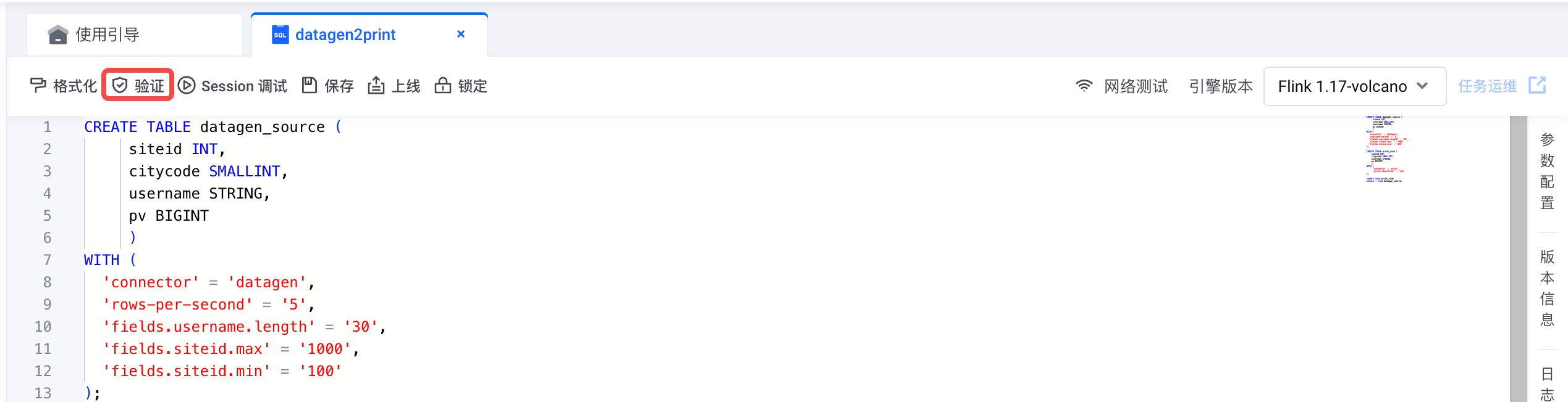 在 Flink 1.16 & 1.17 SQL 任务中,点击“验证”按钮后,如下: