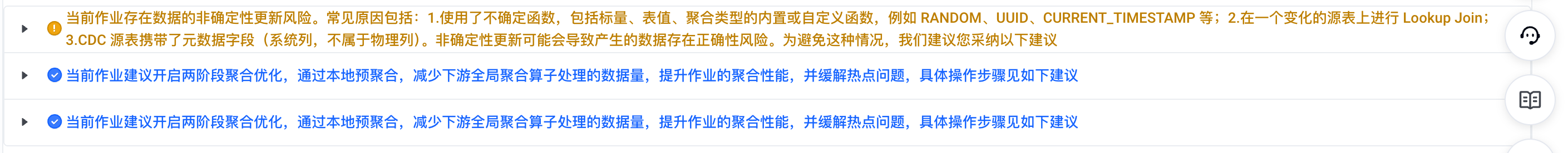 两阶段聚合优化建议 | 当前作业建议开启两阶段聚合优化,通过本地预聚合,减少下游全局聚合算子处理的数据量,提升作业的聚合性能,并缓解热点问题,具体操作步骤见如下建议 |