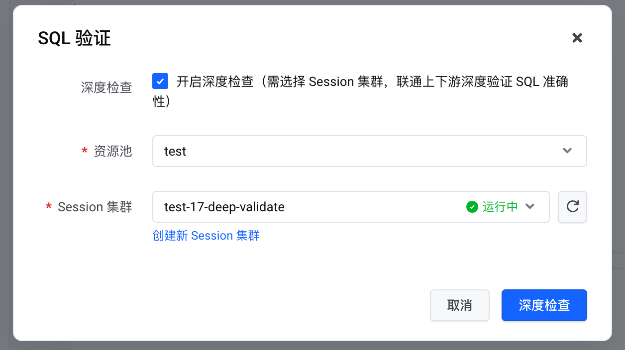 点击后会弹出一个选择框,点选“开启深度检查”,并根据作业版本,选择对应资源池的 Session 集群,之后点击深度检查:
