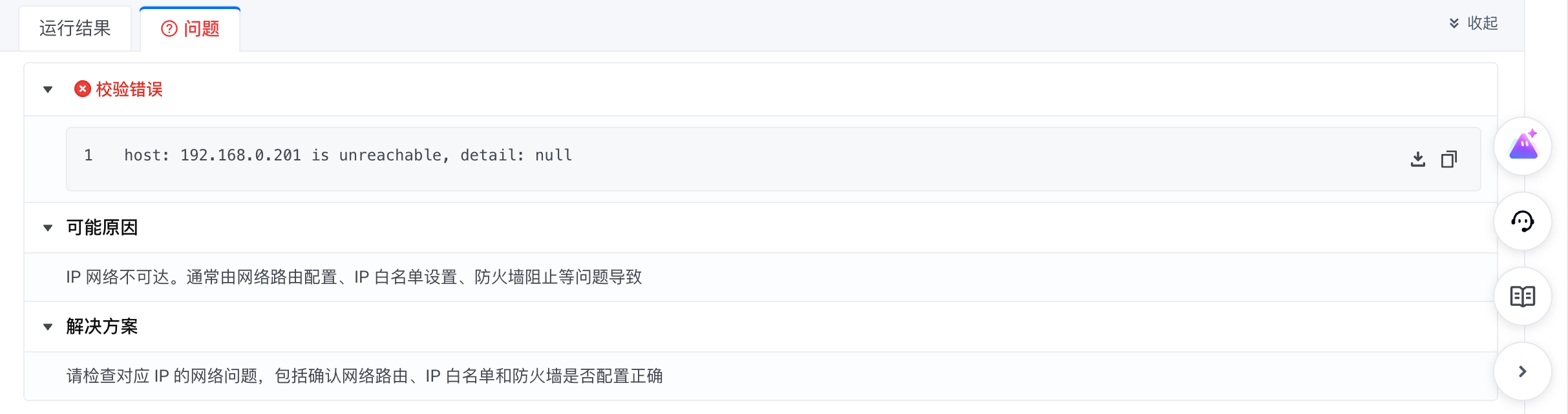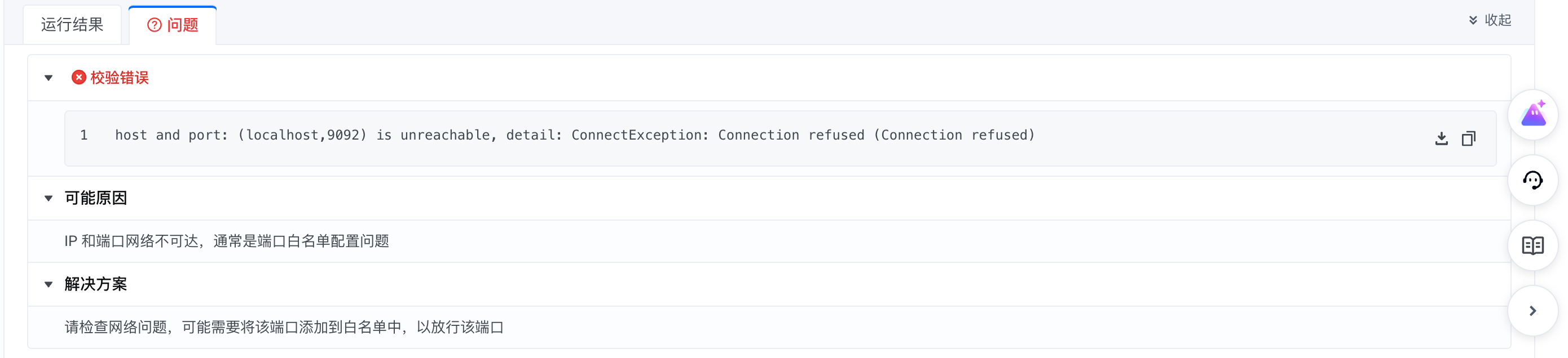 会检测各 Connector 数据源 endpoint 的 ip 和 port 的网络连通性,如果网络访问不通,则快速报错。会先对所有 ip 进行检测,如果 ip 连通失败,则直接报错。如果 ip 都能连通,则继续检测所有 ip 和 port 的组合,如果连通失败,则直接报错,反之,则正常通过。