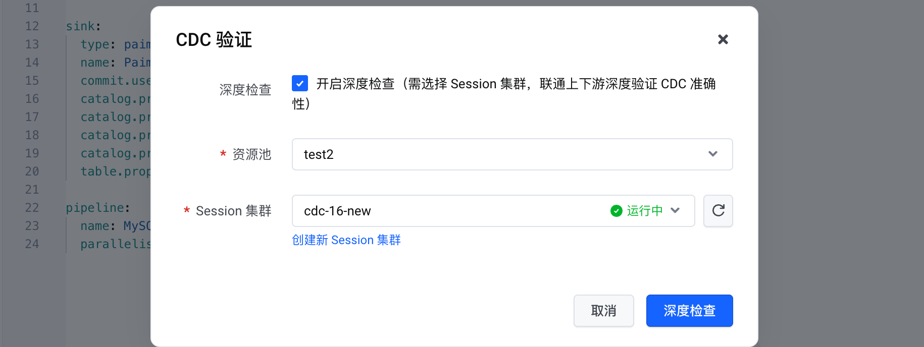 CDC 深度检查能力是一项引擎侧的增强能力,旨在提升产品的易用性。深度检查能够在校验阶段,提前检查 CDC 作业数据源的网络是否连通,作业编译阶段是否有报错。
