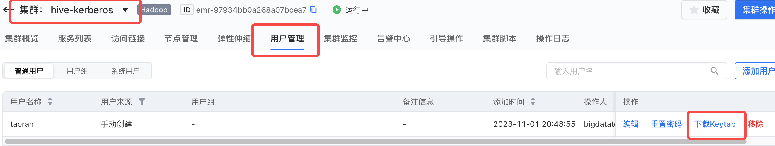 keytab 在 EMR 集群概览页面,需要创建一个用户,在用户管理这边,直接下载即可。