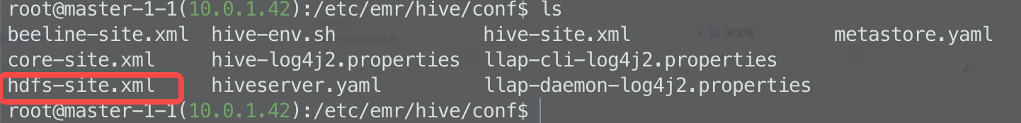 # hive conf 一般在以下这个目录 cd /etc/emr/hive/conf # 没有这个目录的话也可以尝试从环境变量中获取 env | grep HIVE_CONF_DIR