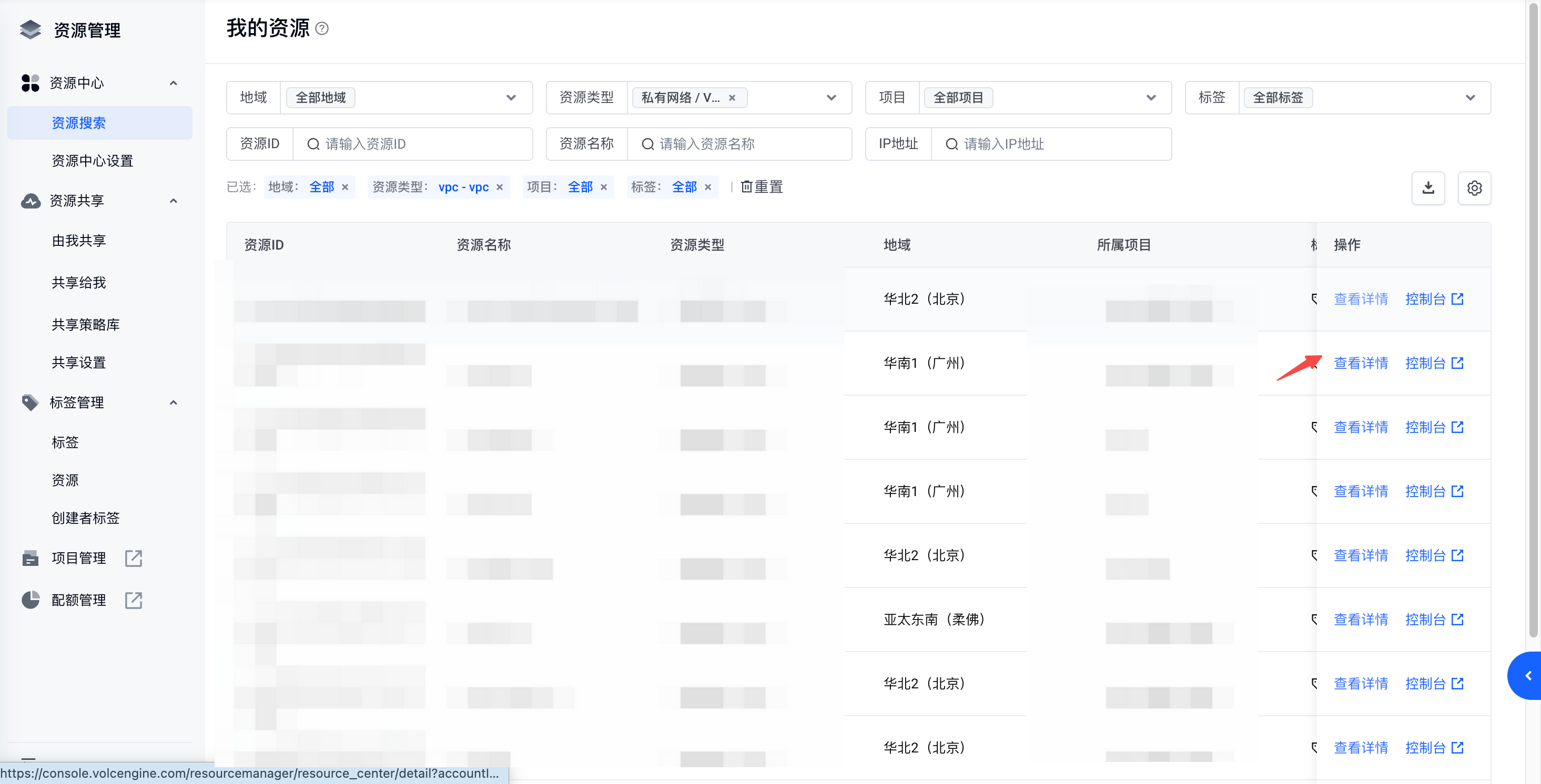 您可通过通过地域、资源类型、项目、标签、资源ID、资源名称等筛选条件,点击搜索查看相关资源