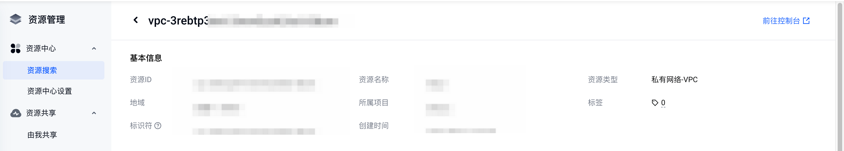 资源基本信息包括资源ID、资源名称、资源类型、地域、所属项目、标签、标识符、创建时间。