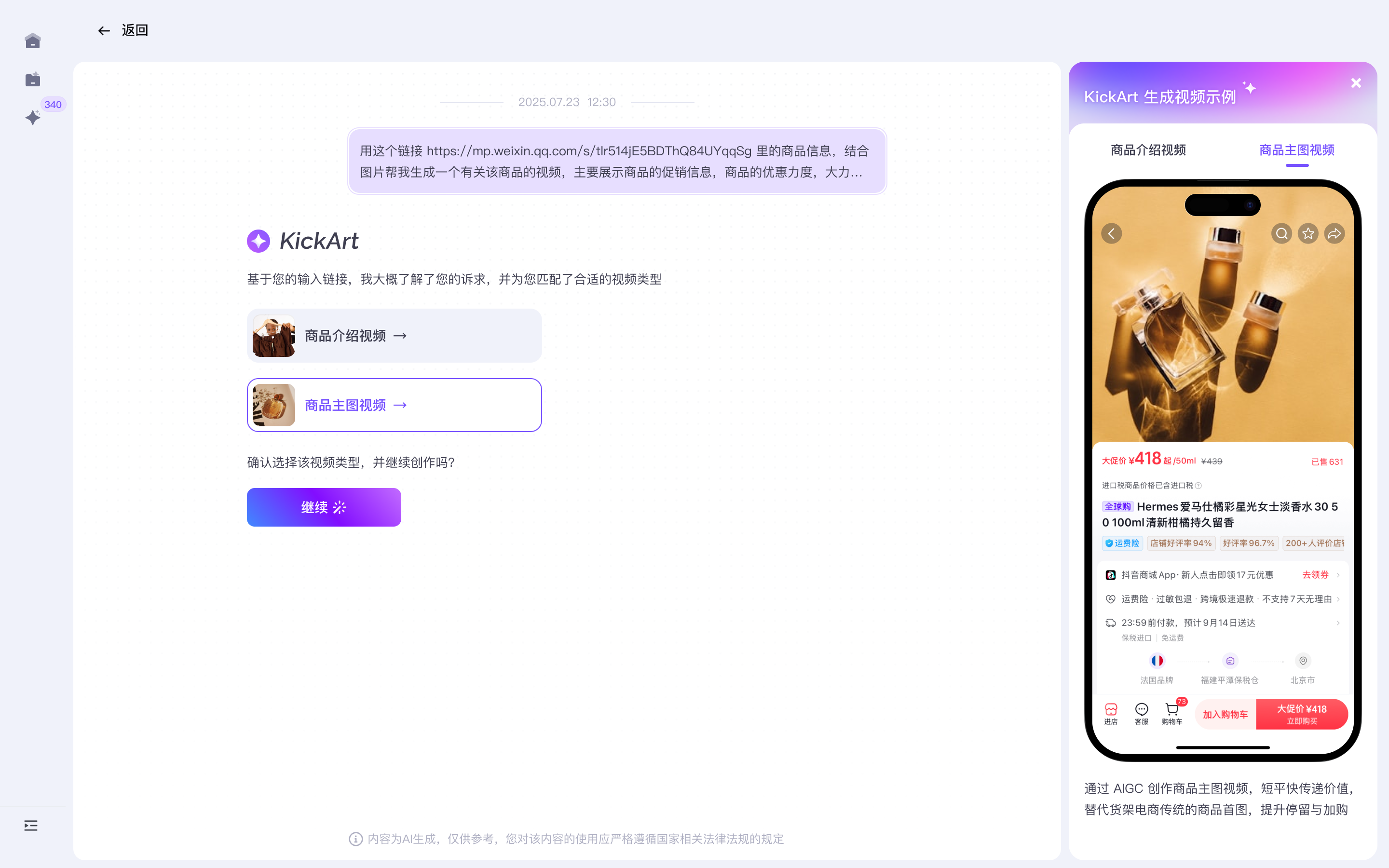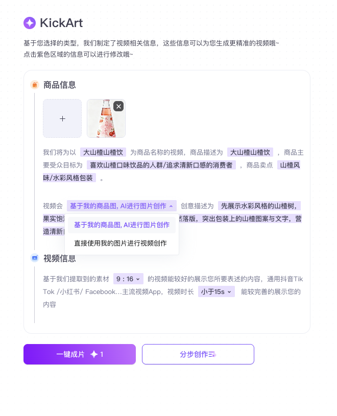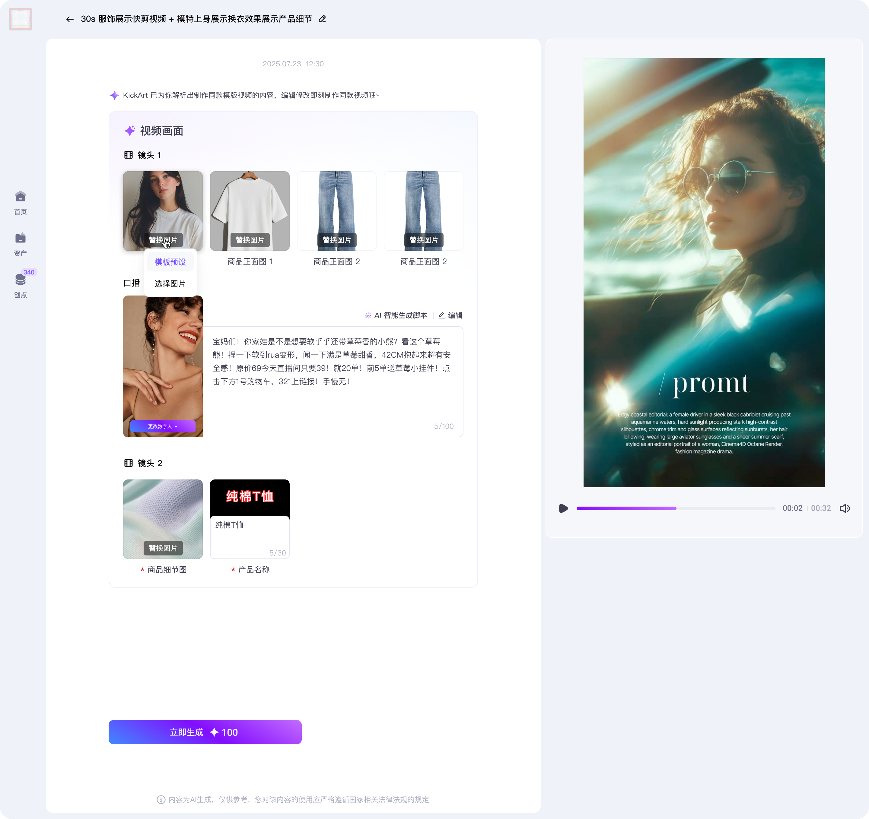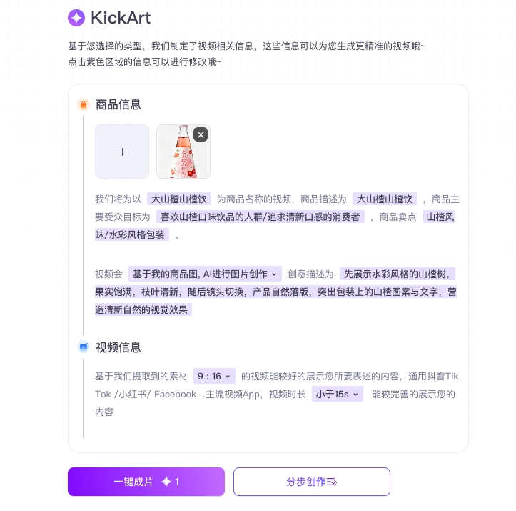 一键成片:将简短创意描述转化为视频,产出比静态商品图传递性更强的主图视频