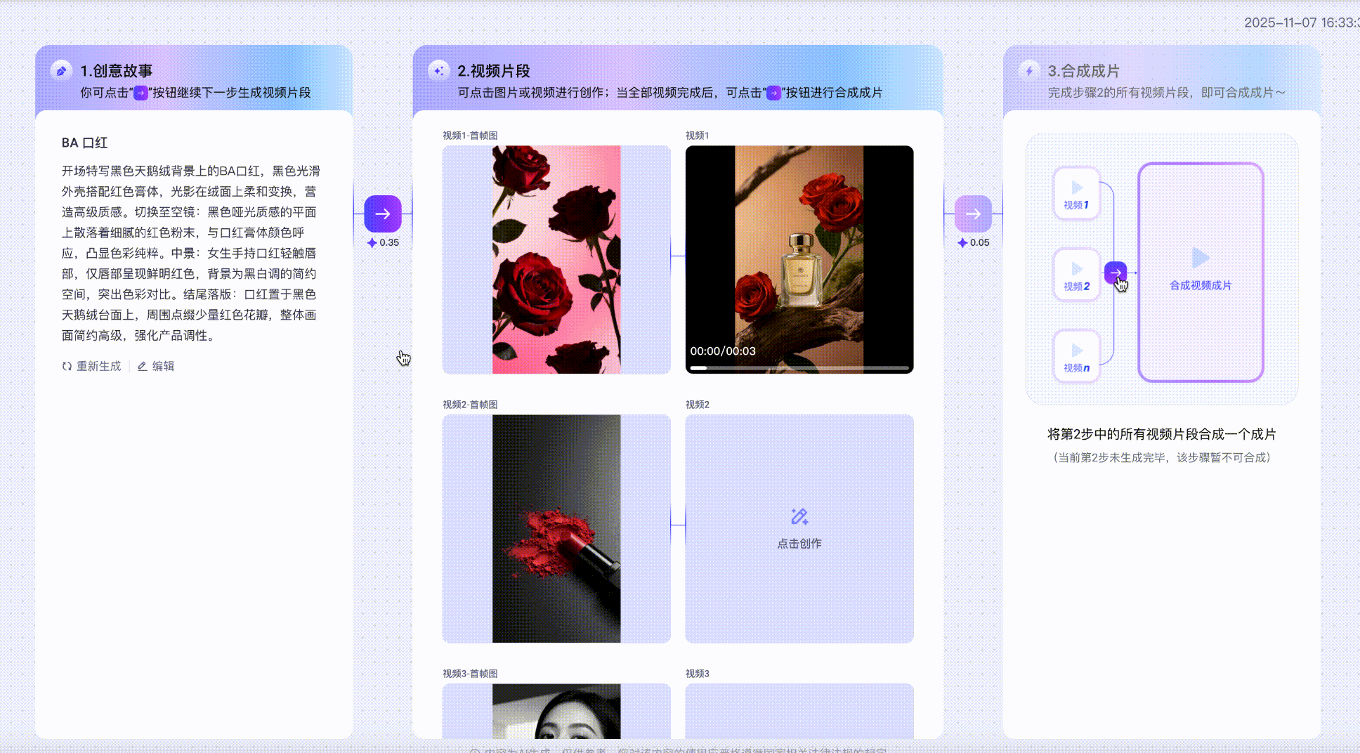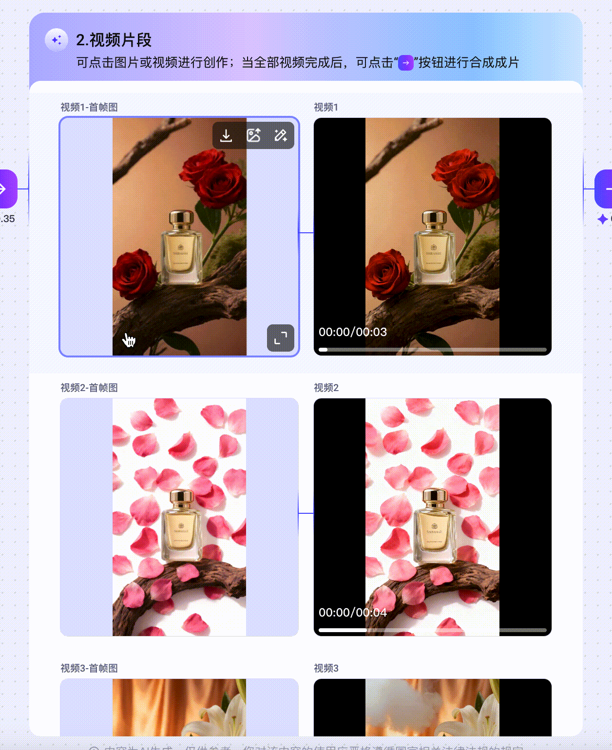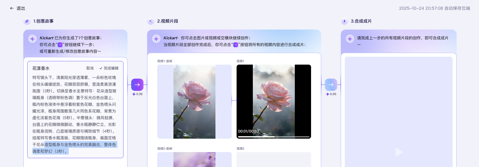 分步创作:输出的视频支持展开分步查看,局部调整某个视频片段