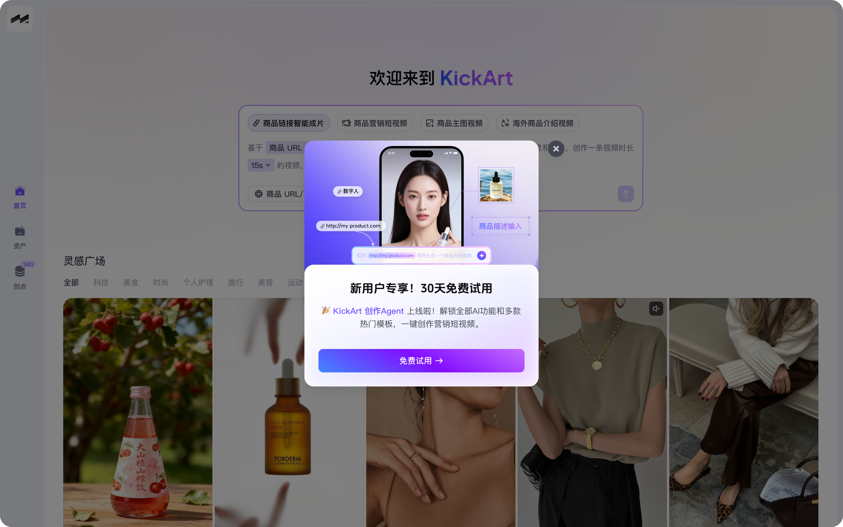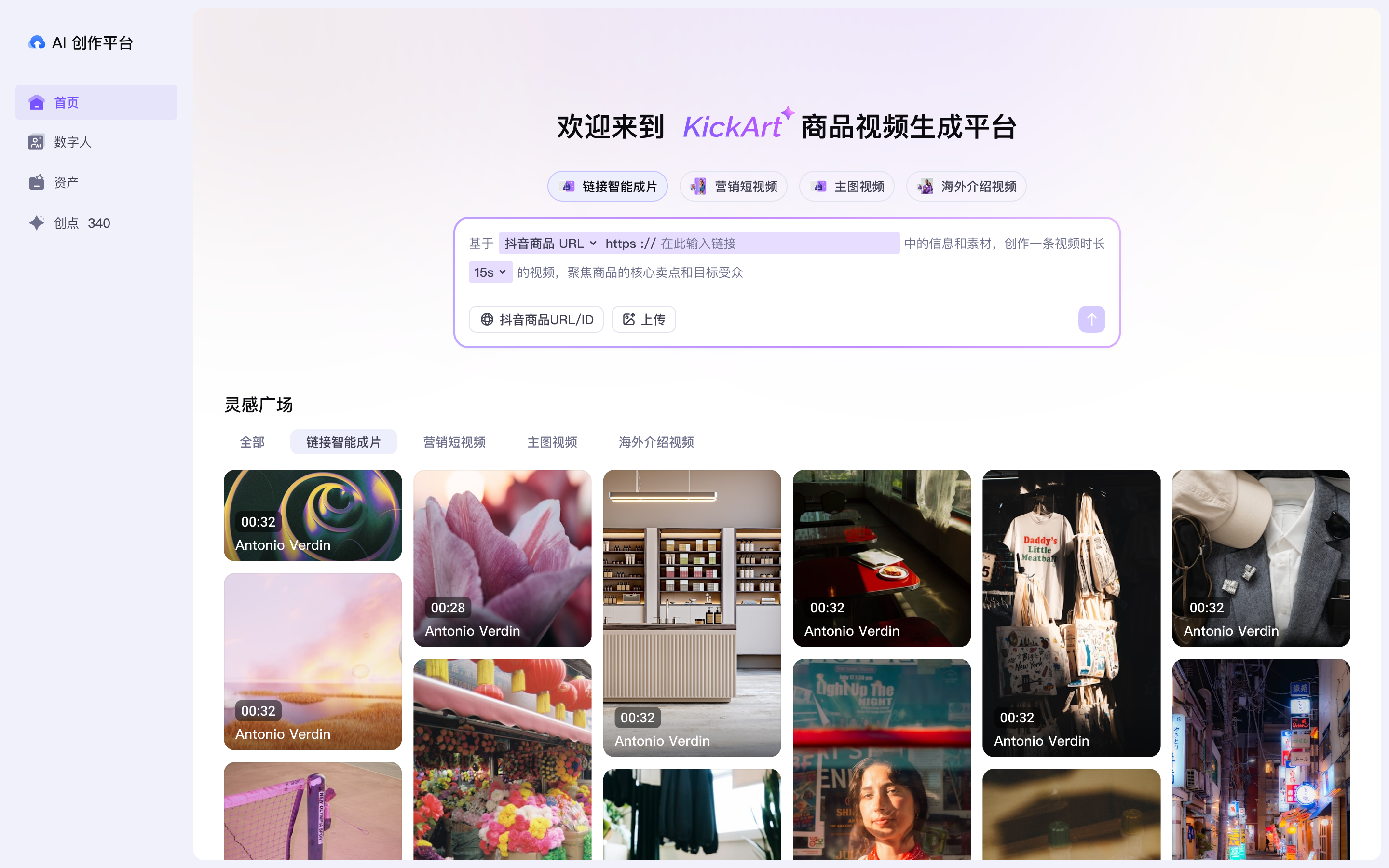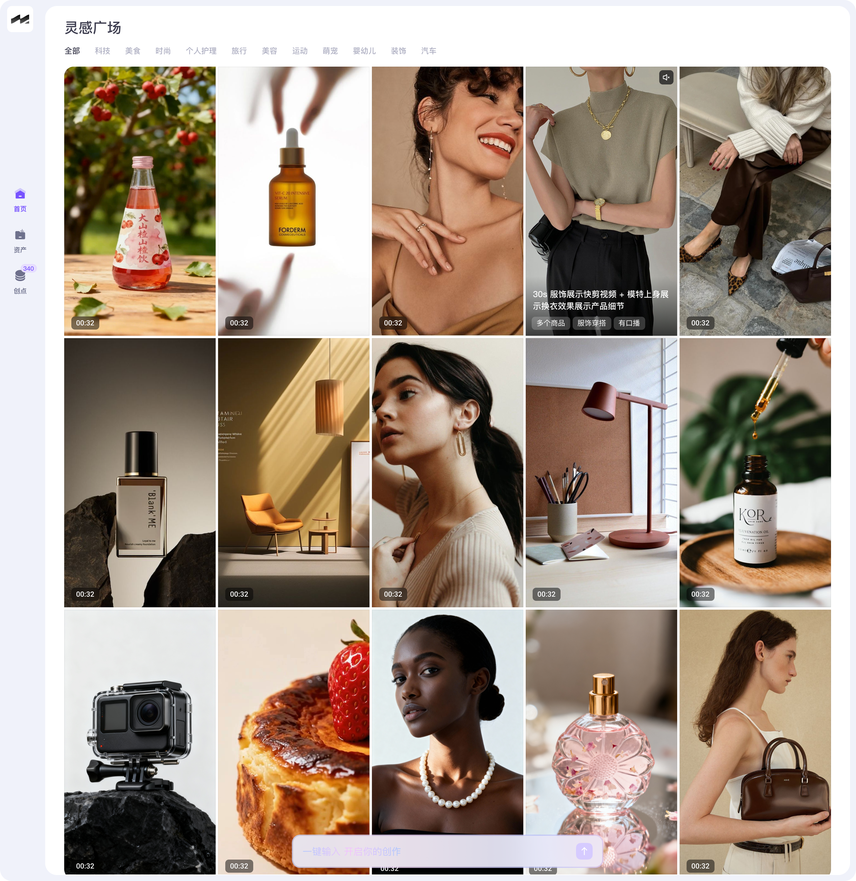 在首页输入商品 URL 或者 上传素材,描述你想生成的视频