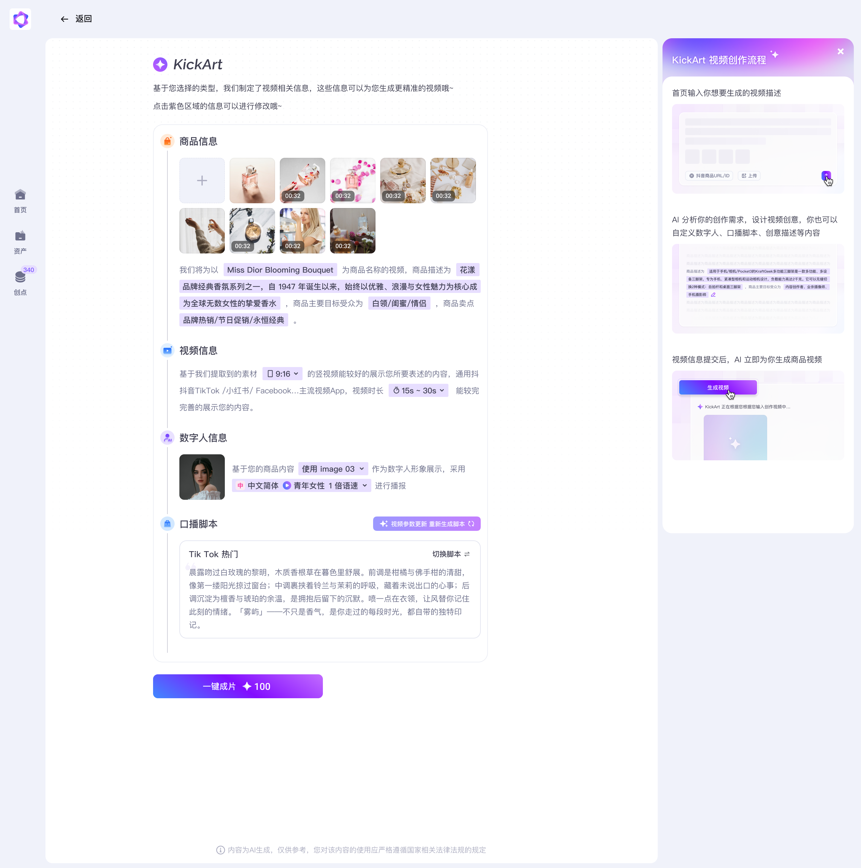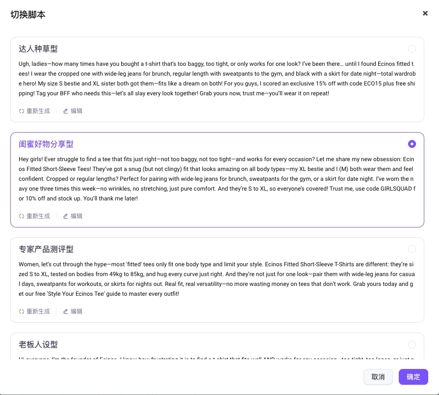 基于商品信息,AI 根据视频语言、时长生成口播脚本