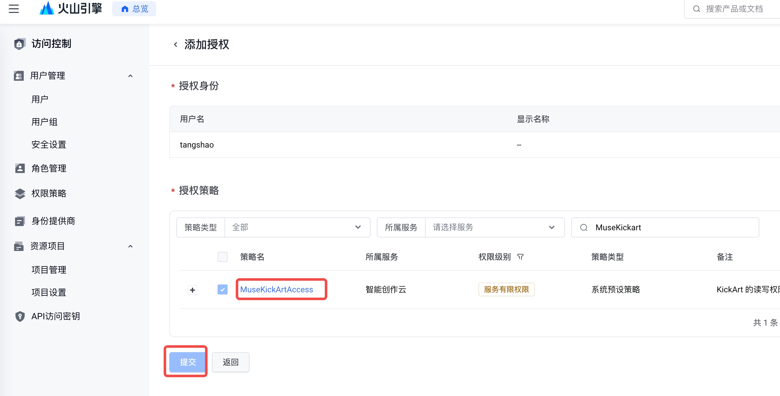 | 步骤一:登录火山引擎选择“企业”-“访问控制” | 步骤二:“用户管理”-“用户”-“添加权限” | 步骤三:策略名选择“MuseKickartAccess”后提交 |