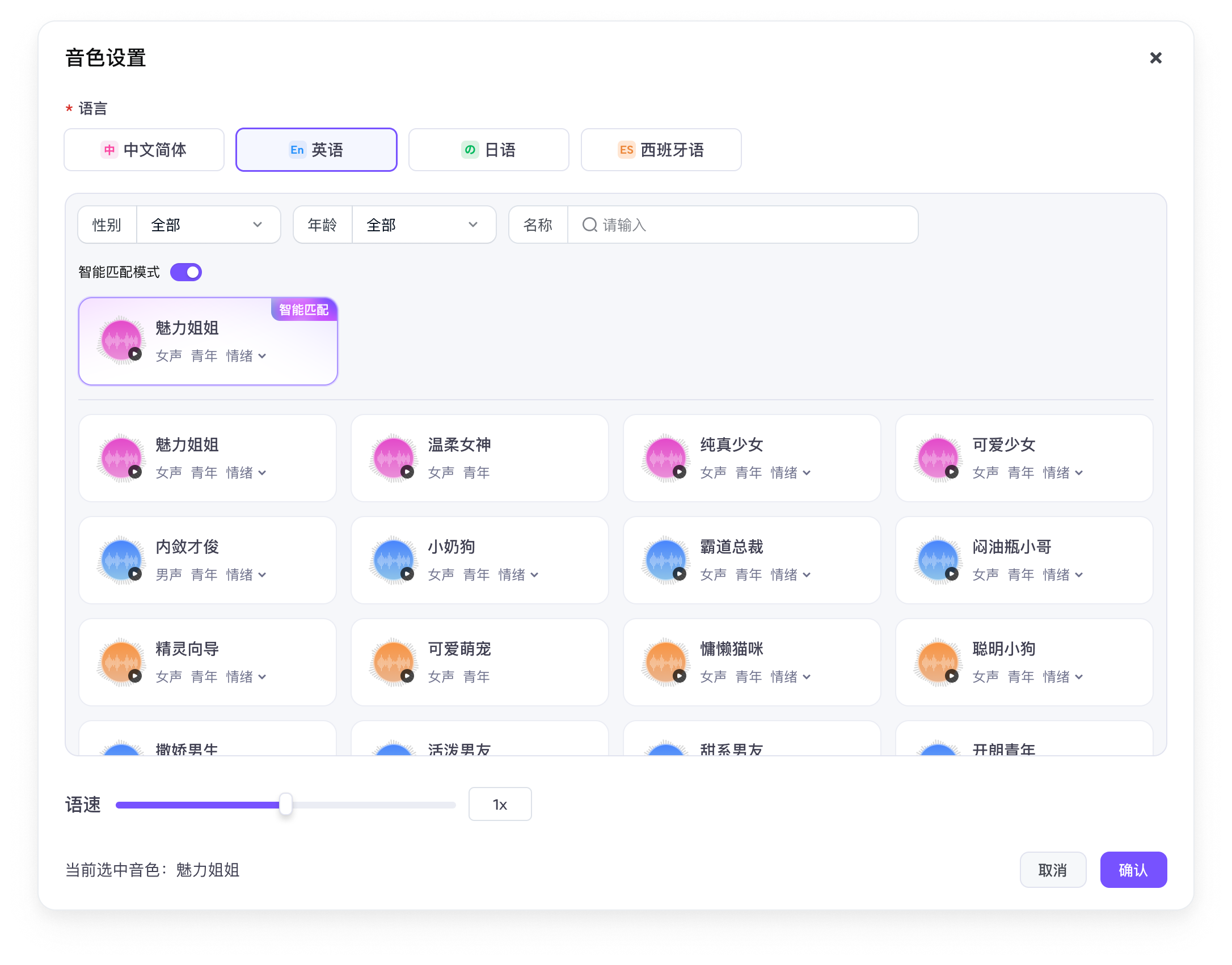 平台数字人:平台提供多种数字人,适用于不同场景、不同语言