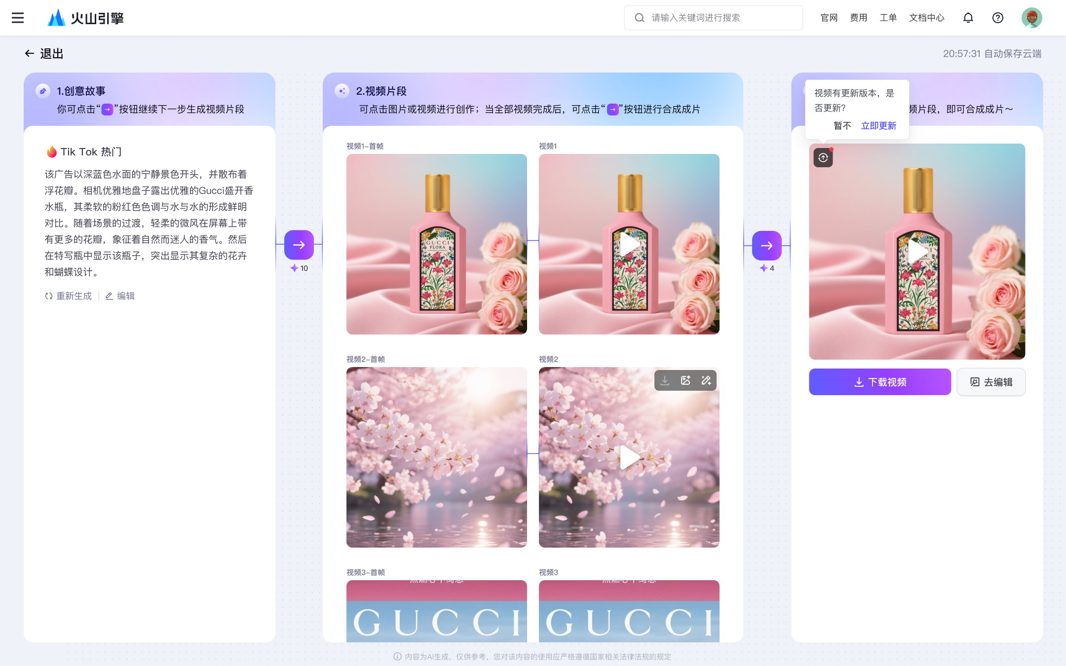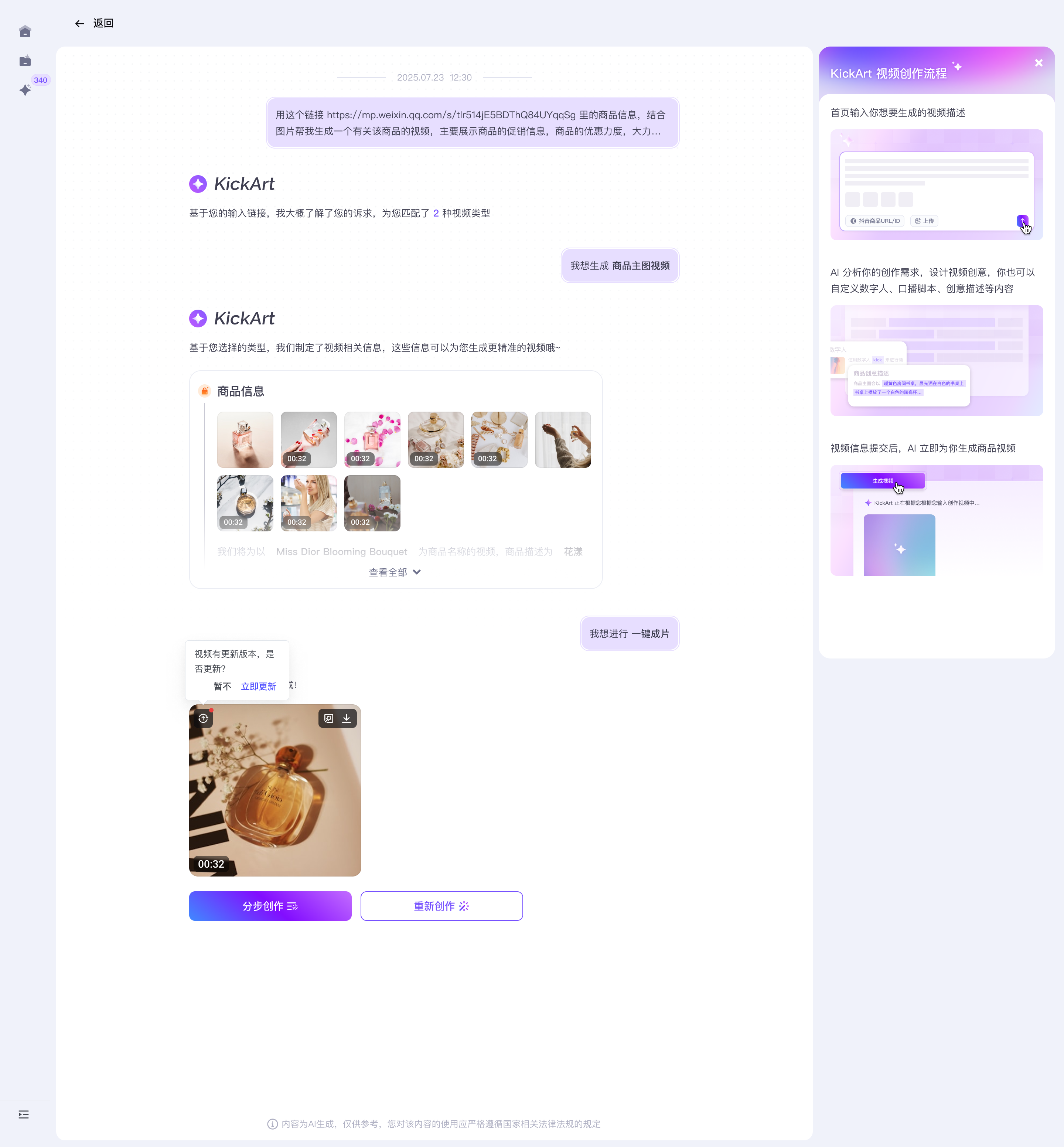 在编辑器中更新视频后,当你在对话页或分步创作模式下查看该作品时,会收到更新提示。你可以一键更新,将成片同步为最新的草稿版本