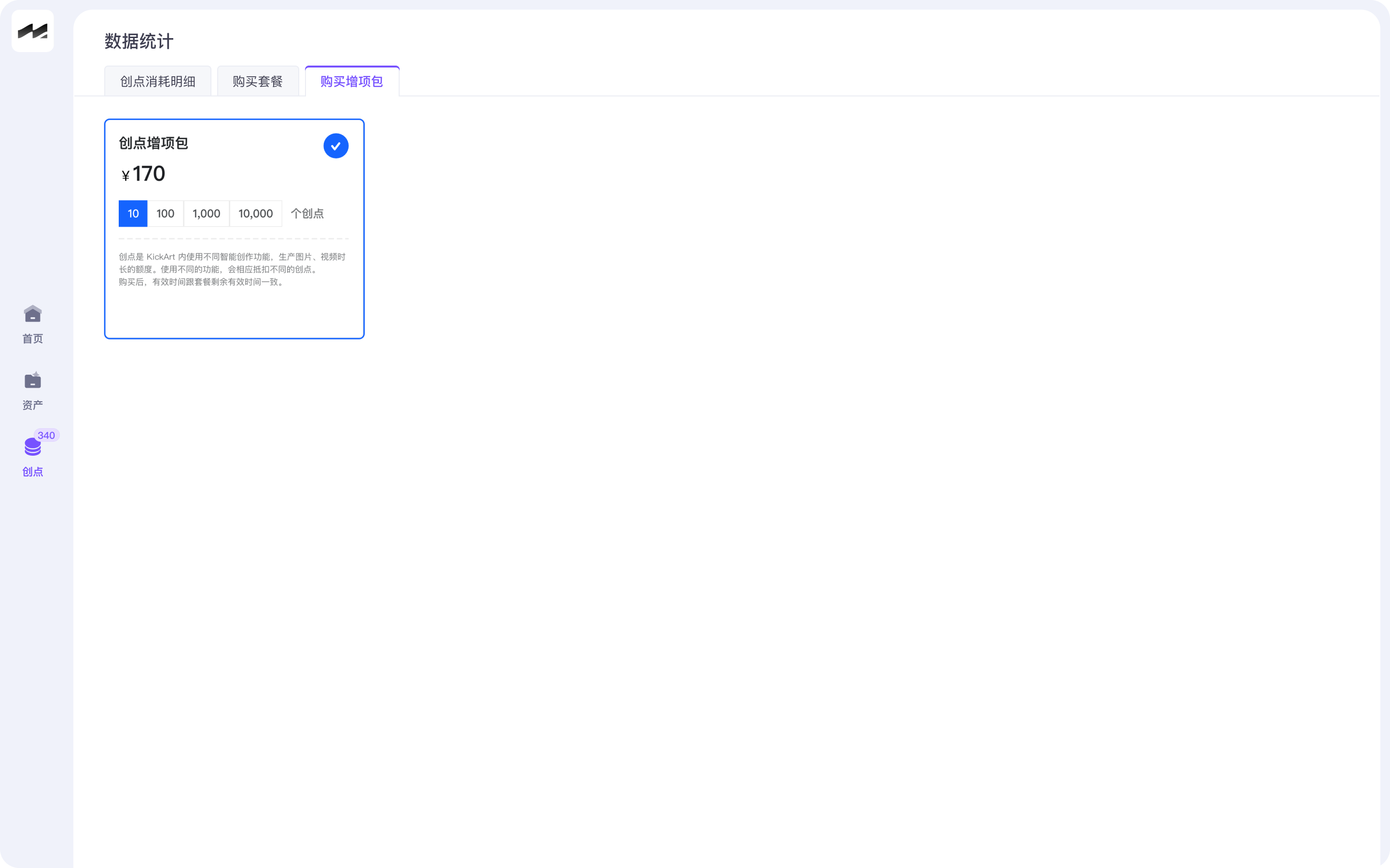 创点不足:当你的套餐仍然有效但创点已耗尽时,相关功能按钮会置灰。悬停按钮时,气泡卡片会提示“当前创点不足,请前往购买增项包”,点击即可跳转到购买页面