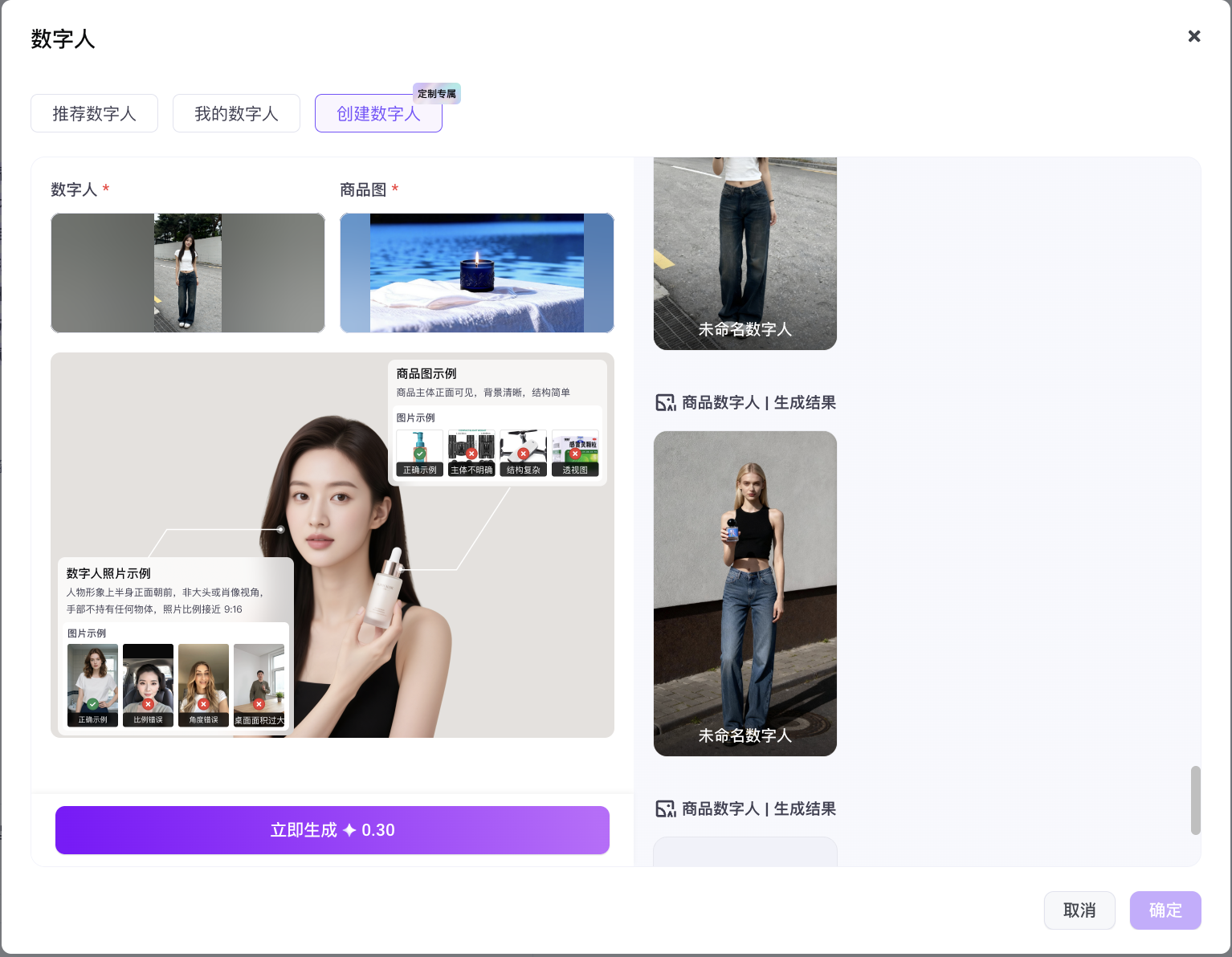 商品数字人:用户可以创建专属数字人,上传商品+数字人图片,即可生成商品数字人,在视频中能更真实、更有效的展示商品