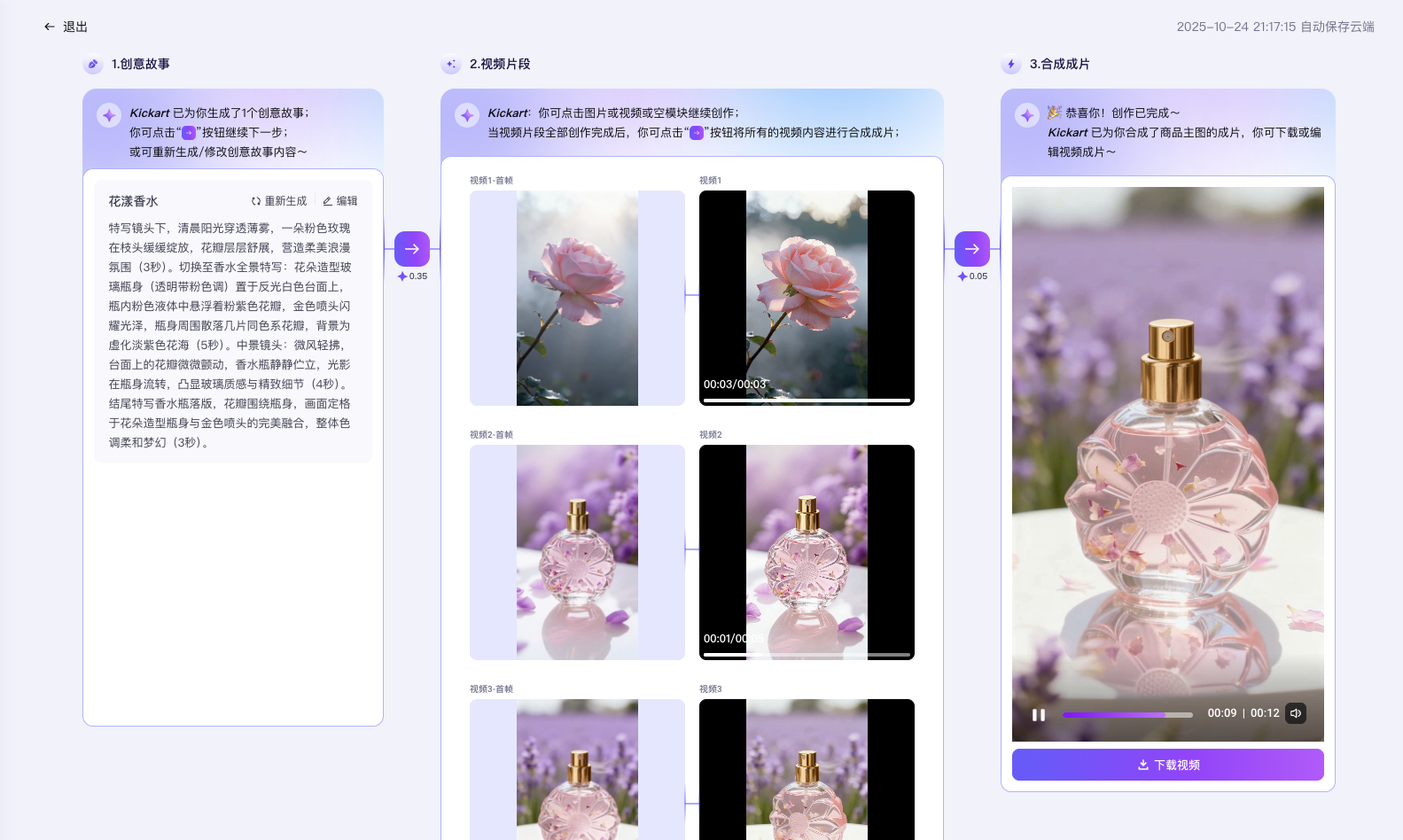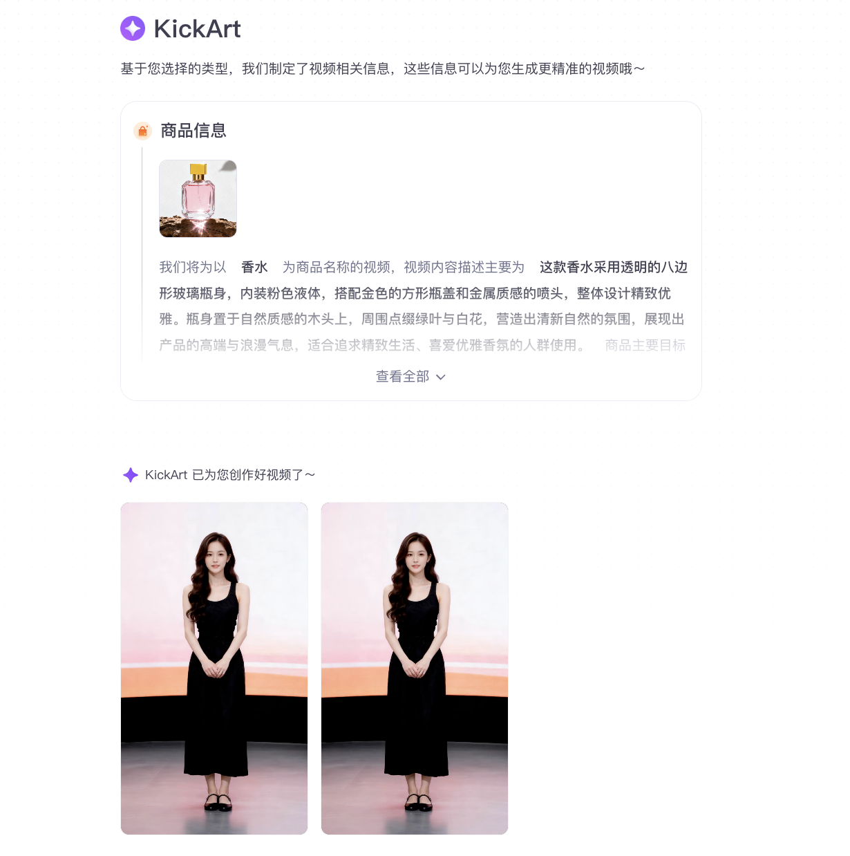 「基于我的商品图,AI 进行图片创作」:进行 AI 生图,基于 AI 生成的图片进行视频生成