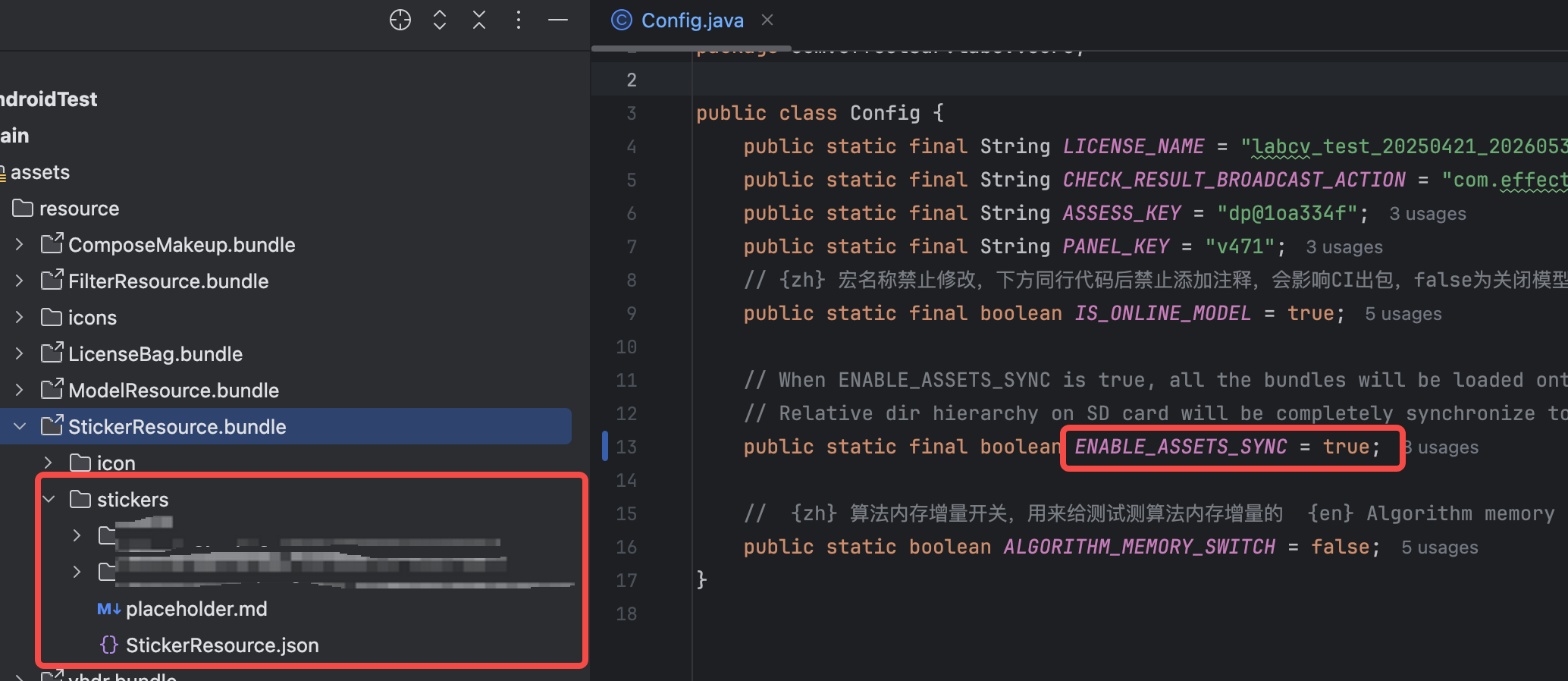 找到Config.java,修改ENABLE_ASSETS_SYNC为true