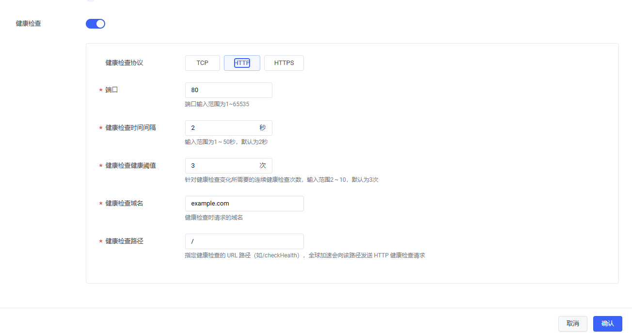 健康检查路径 | 仅当 健康检查协议 为 说明 由于全球加速发送的是 HTTP GET 请求,于是全球加速会接收完整的 HTTP 响应才完成该次检测。为了节省您的服务器资源,建议您指定一个尺寸较小的资源。 |