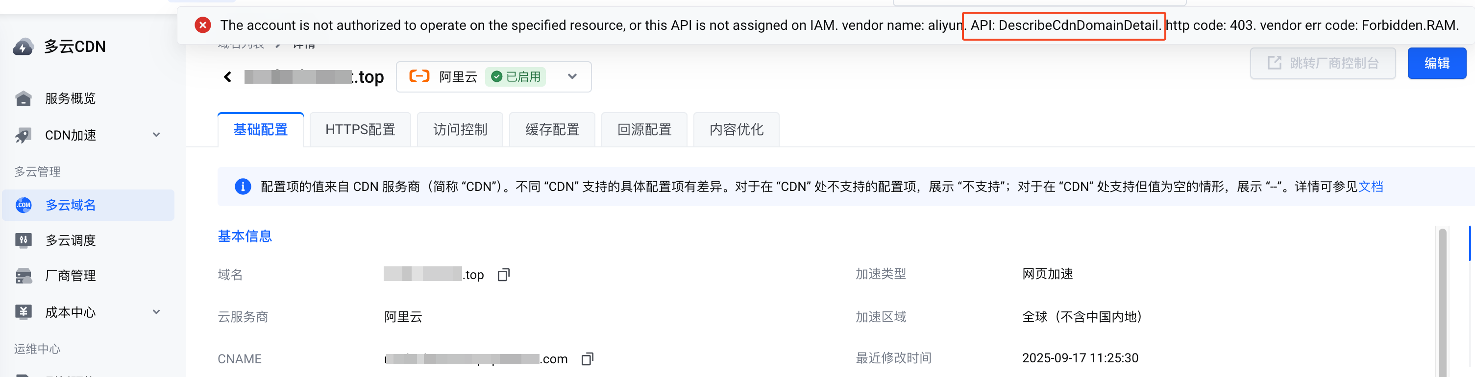 在多云CDN控制台的 多云域名 页面,当您点击某个域名以查看其详细配置时,收到权限不足的错误提示。