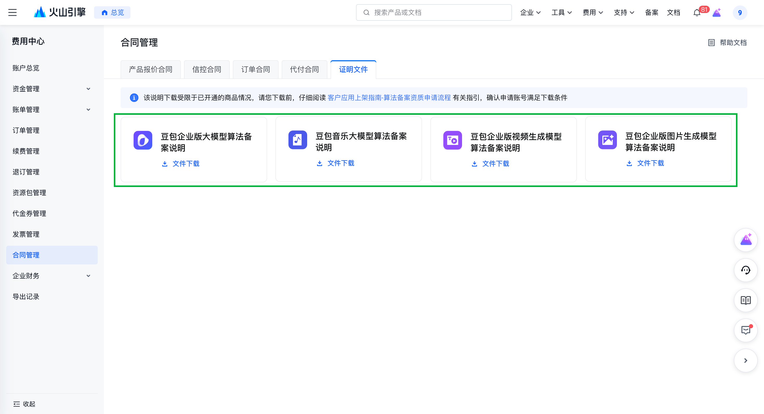 火山引擎大模型客户可以按照以下方式自助获取和使用有关资质材料: