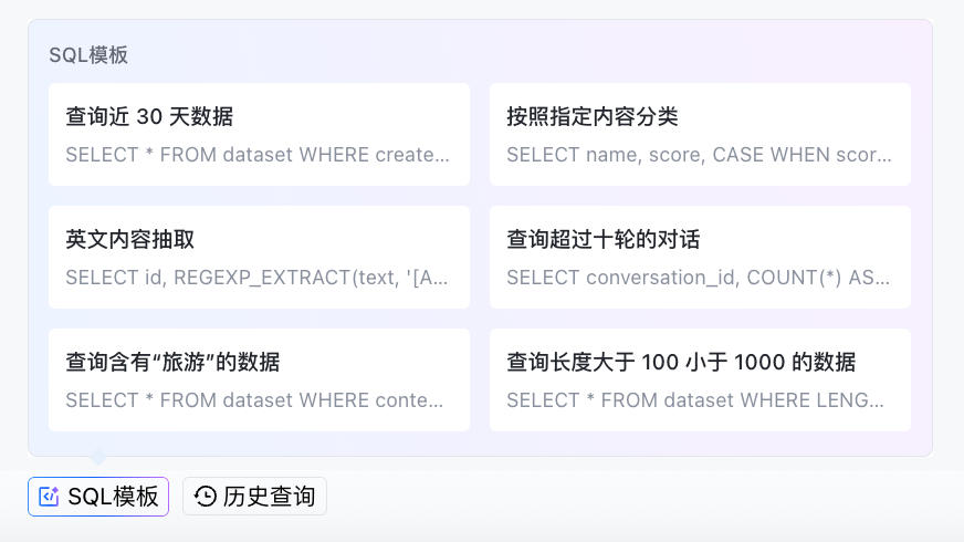- 如图所示,您可在左下角回顾历史查询,也可选择 SQL 模板进行快速查询。您只需选择相应模板并运行查询,即可轻松获得准确结果。同时,点击右上角的全屏预览可进入沉浸式浏览。