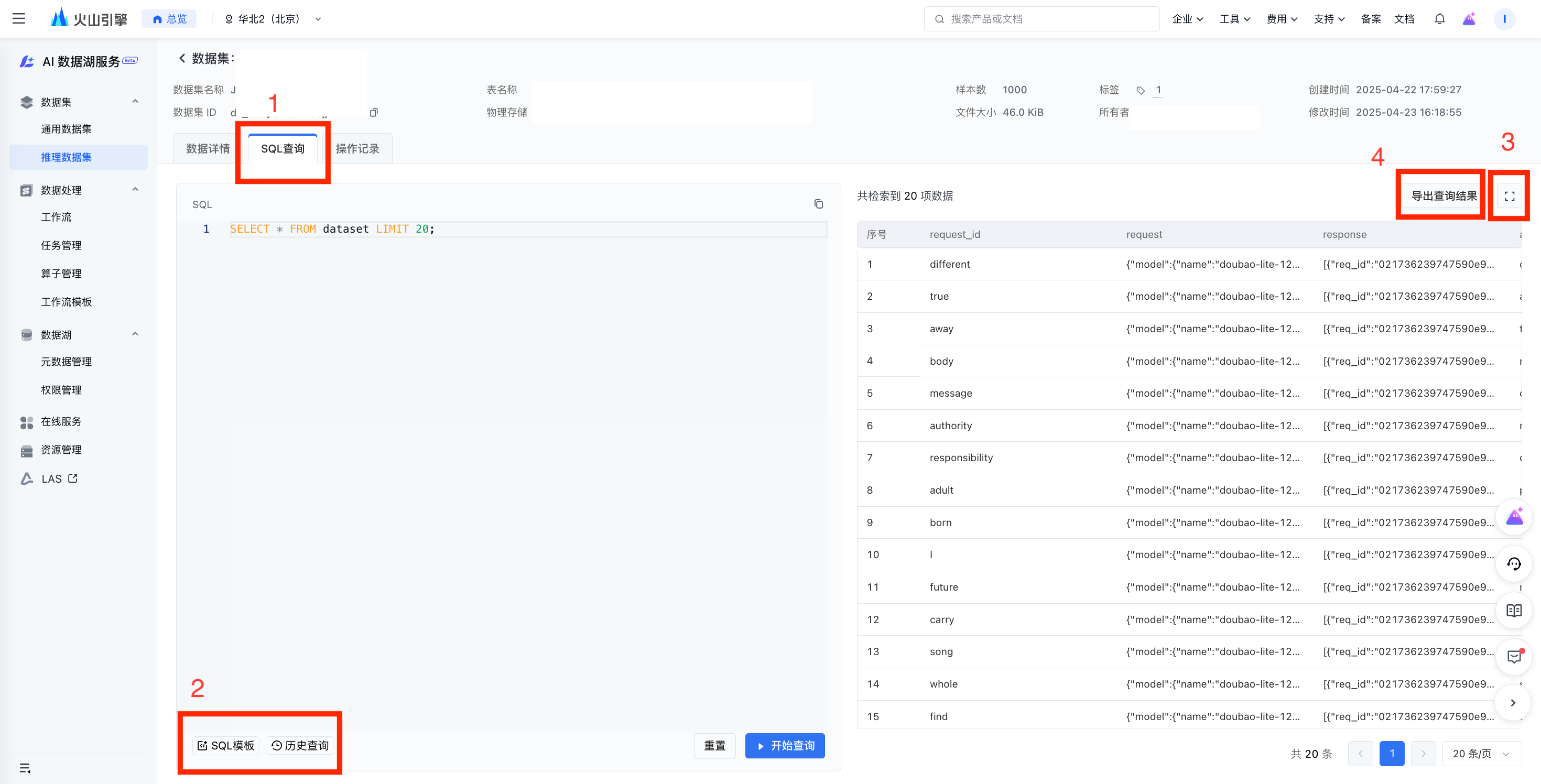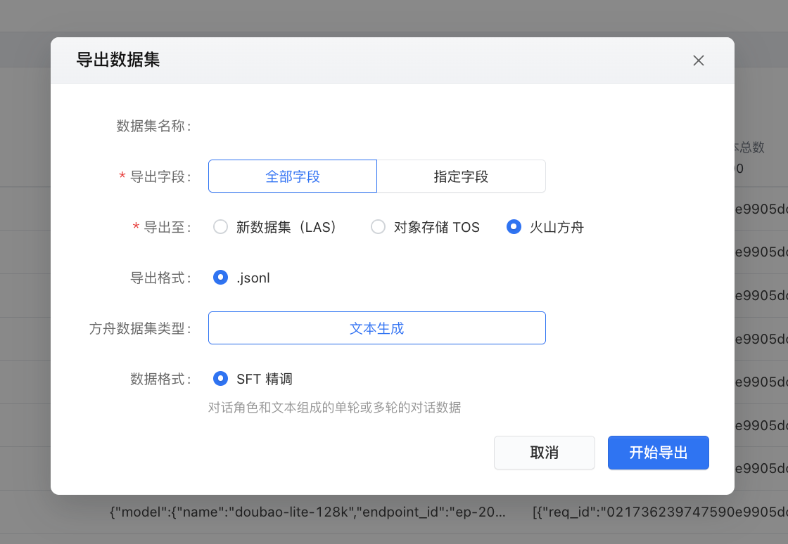 - LAS 支持将 推理数据集 直接导出至方舟数据集以发起模型精调,同时也支持 SQL 查询结果直接导出至方舟。