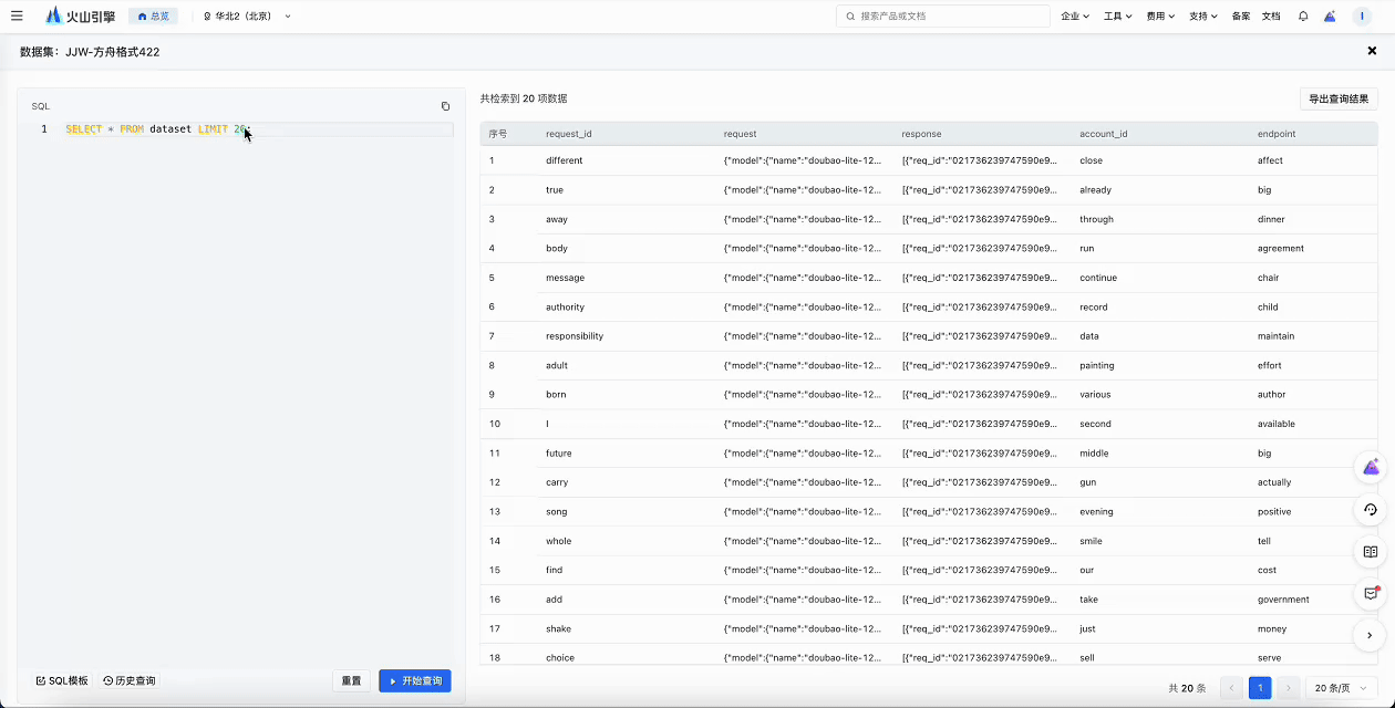 - 通过 API 调用推理接入点后,数据自动以结构化形式入库至 我的数据湖。进入火山方舟 > 数据集 > 我的数据湖 以查看调用详情。