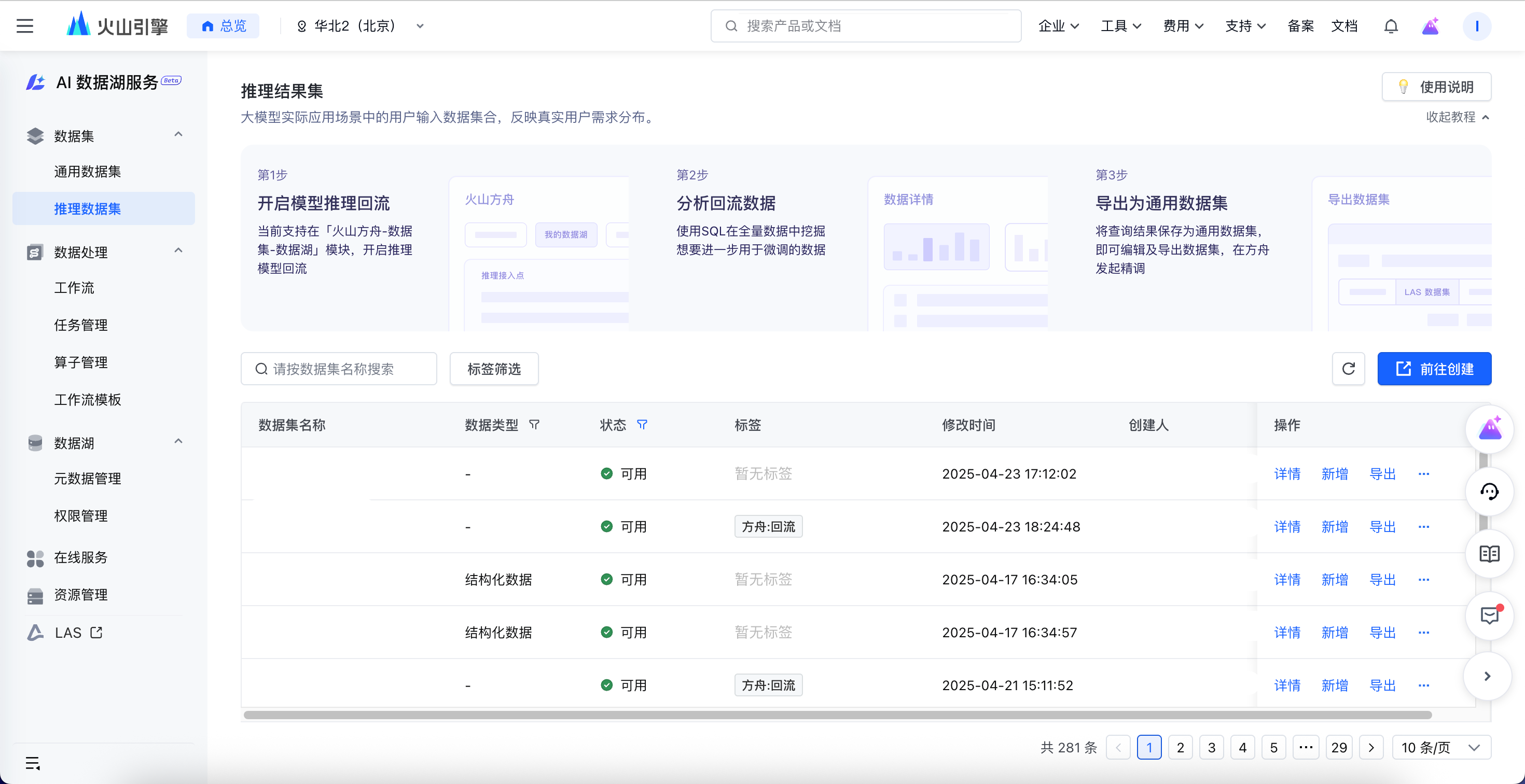 - 单击 前往AI 数据湖服务编辑数据,进入 LAS 控制台 > 数据集 > 推理数据集,查看对应 推理数据集。