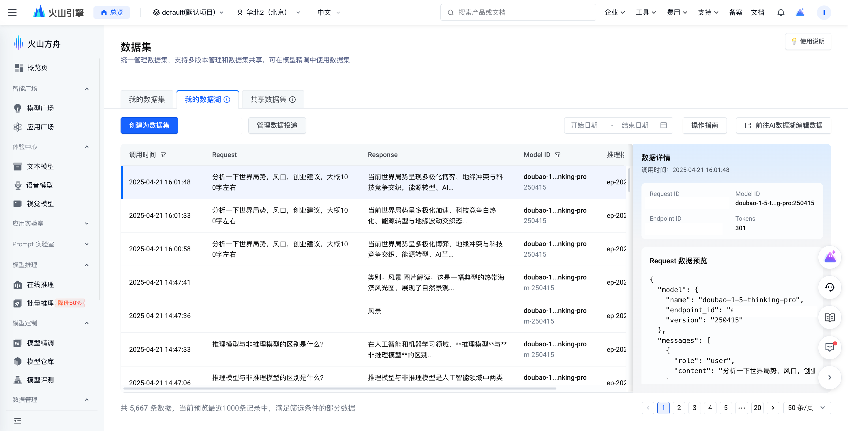 在 数据集 > 我的数据湖 页面,通过“调用日期、模型版本、推理接入点 ”等筛选条件在全量数据中筛选出所需的数据范围,您可将筛选出数据采样并创建为数据集,用于模型精调等场景。