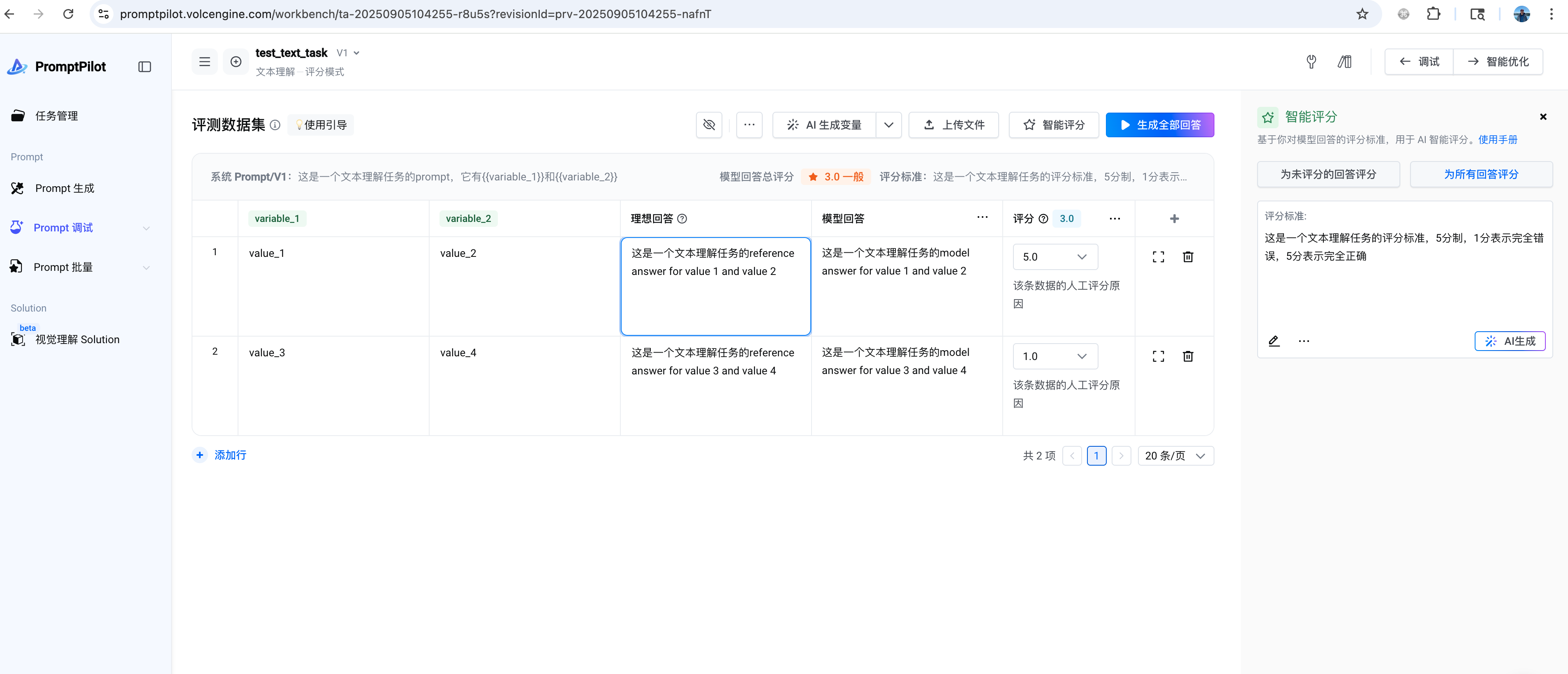 此时,登陆PromptPilot Console页面的批量评测,你将看到回流的数据