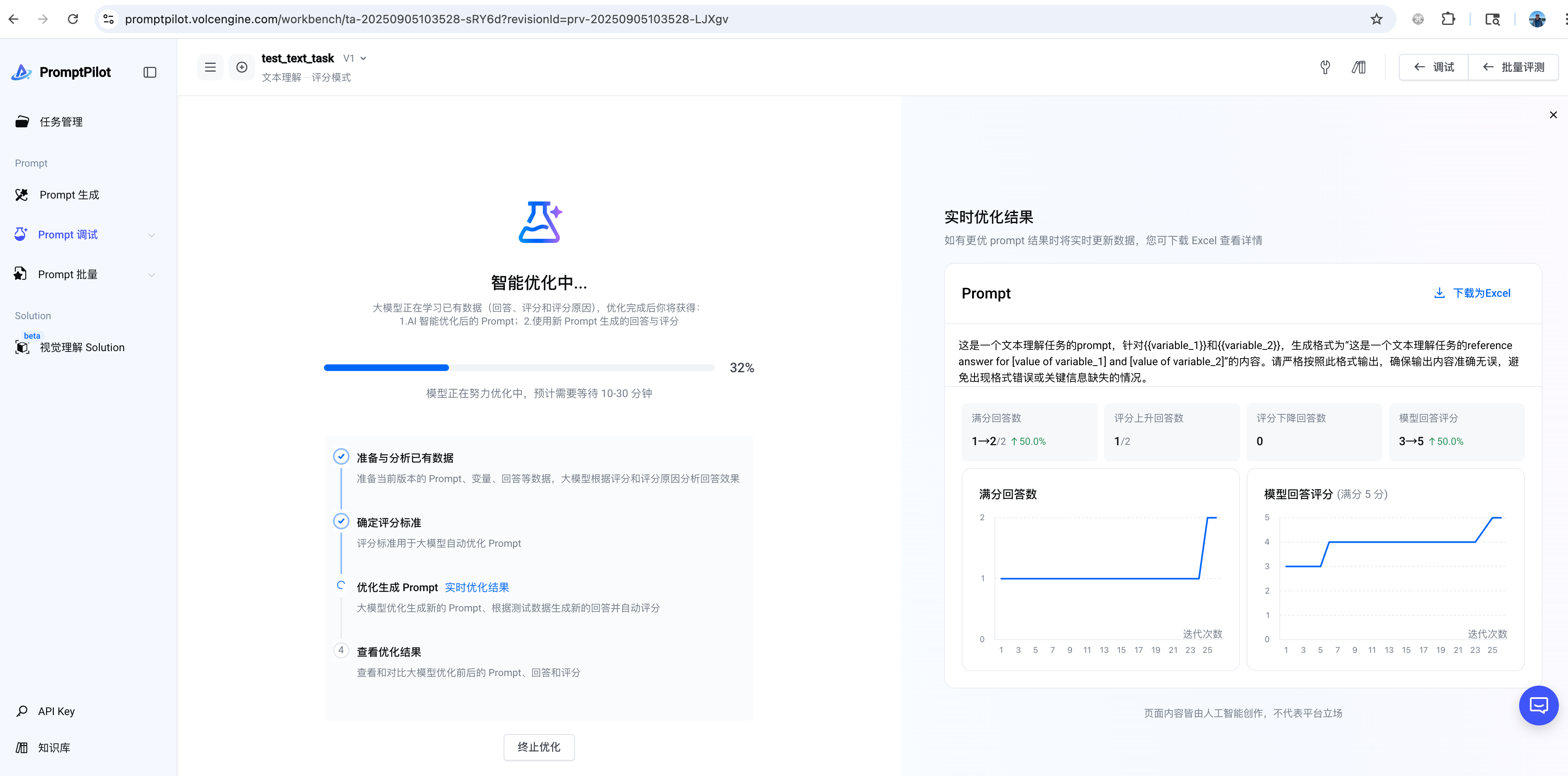 你也可以登陆PromptPilot Console页面查看实时进展监控曲线