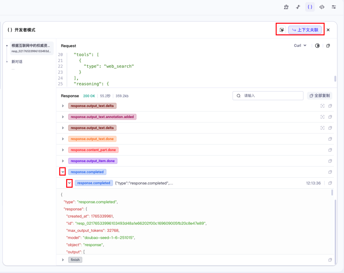 体验中心提供开发者模式,开启后,开发者面板将实时展示 API 请求和返回结果,方便您查看、导出与模型交互的详细代码逻辑。