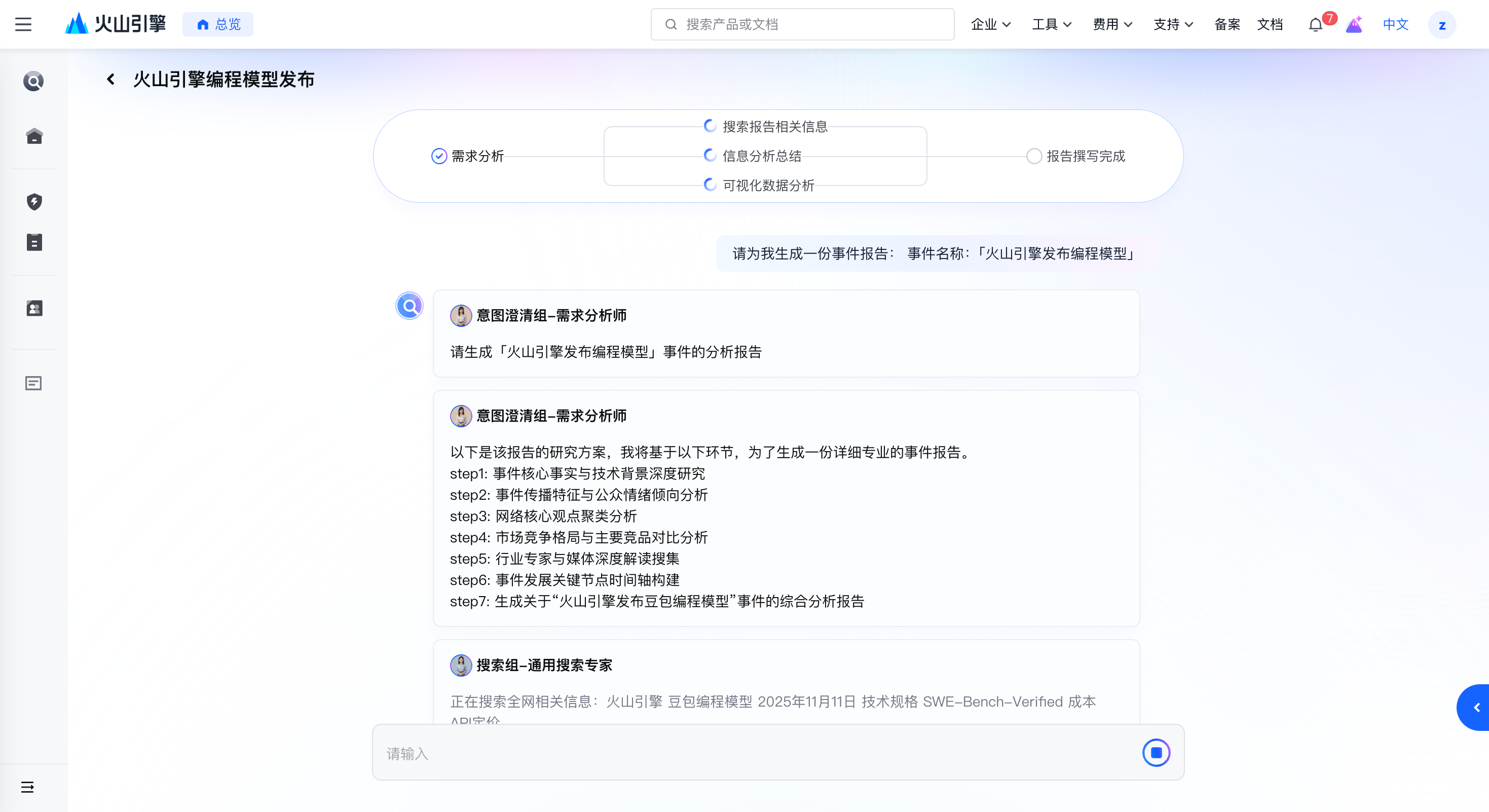 输入完成后,Agent 专家将会按照输入的内容进行需求分析,并按照报告框架收集相关信息并完成数据统计。 该部分由于信息数量的不同报告生成时间会有一定区别,请耐心等待。