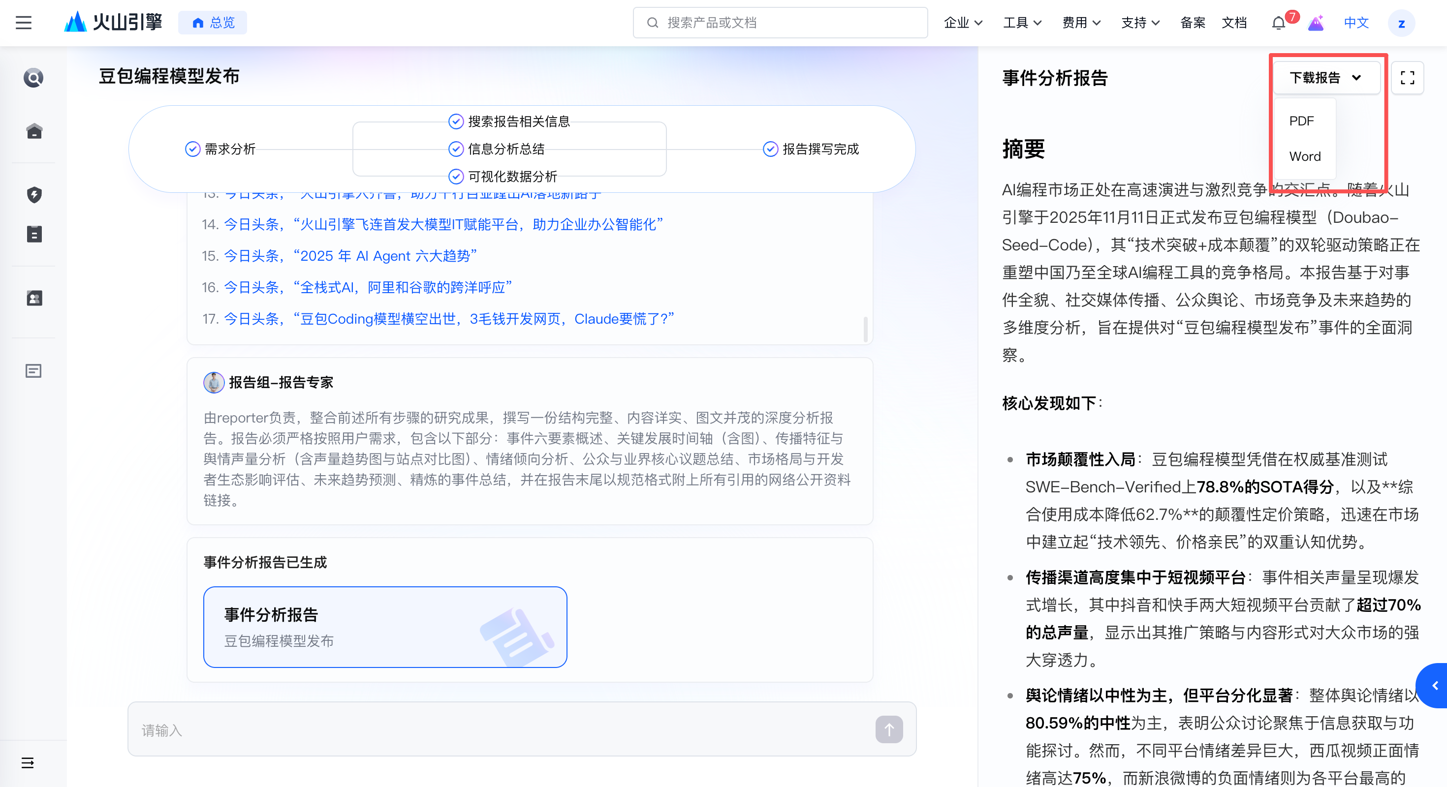 报告生成后支持下载到本地,目前格式支持 word 和 pdf,您可按照需求进行下载。
