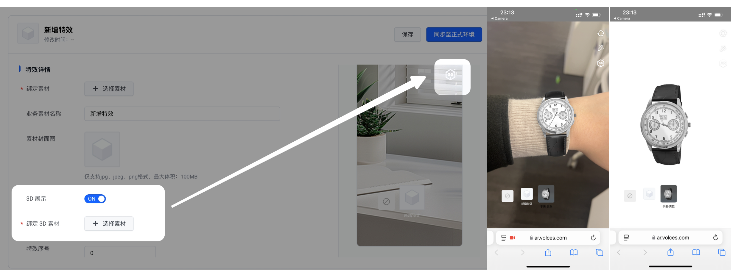 3D展示开关: - 打开后,在体验页菜单将出现3D展示按钮,用户点击后将从AR展示转为3D展示模式