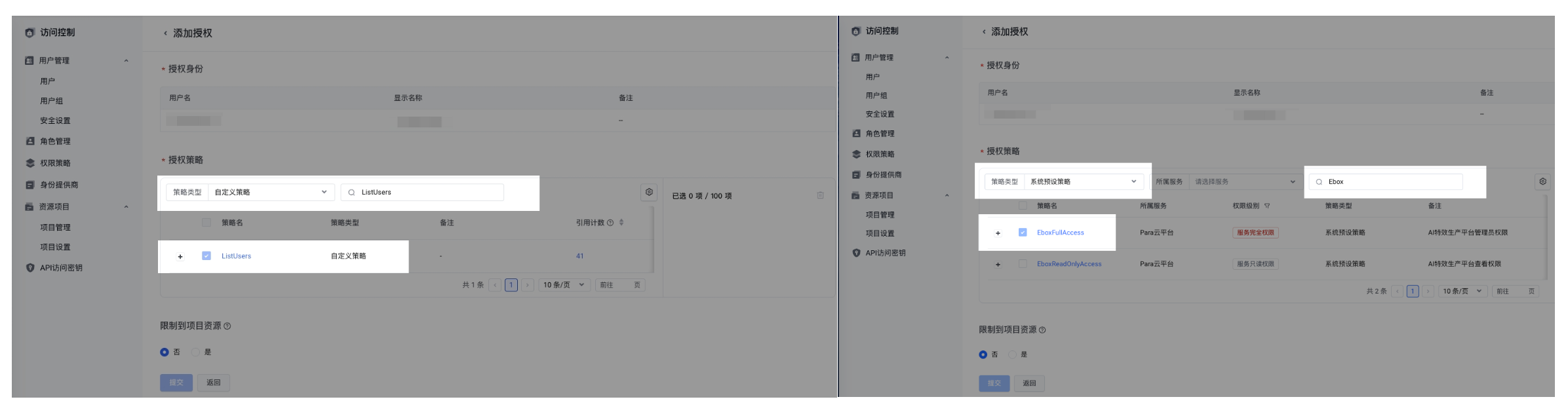 添加自定义策略:Listusers 添加系统预设策略:EboxFullAccess